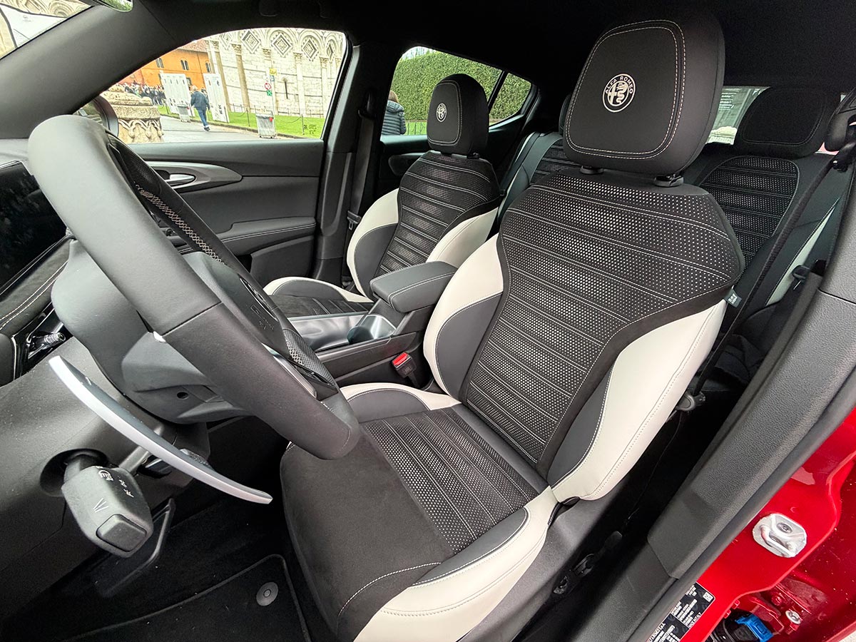 Was die Ausstattung betrifft, so ist er mit der 360°-Kamera und ihrer "Drohnen"-Ansicht, den beheizten und belüfteten Sitzen, dem beheizten Lenkrad oder auch dem Induktionsladegerät vollkommen auf dem Stand der Dinge, den man anderswo findet. Die Innenausstattung wirkt zwar weniger "Hightech" als bei den Deutschen, aber gerade das macht den Charme und die Untypizität von Alfa Romeo aus.
