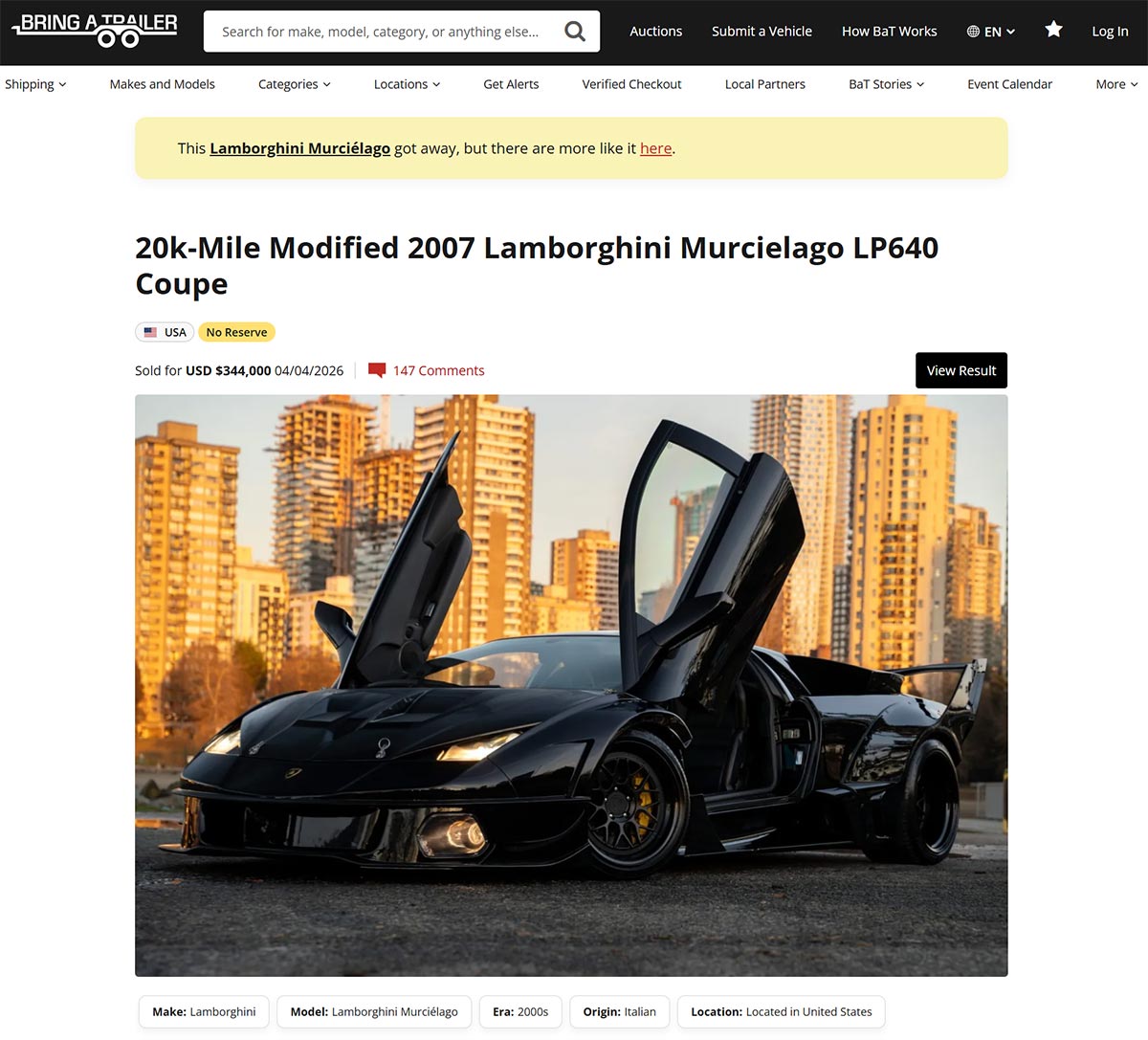 Trotz seines extremen Stils hat dieser ungewöhnliche Murciélago gerade bei einer Auktion ohne Mindestpreis für 344.000 Dollar einen Käufer gefunden. Eine Zahl, die überraschen kann. Denn während die Werte von Murciélagos stark ansteigen, insbesondere bei den originellsten Versionen und mit Schaltgetriebe, bleiben modifizierte Modelle in der Regel weniger begehrt.