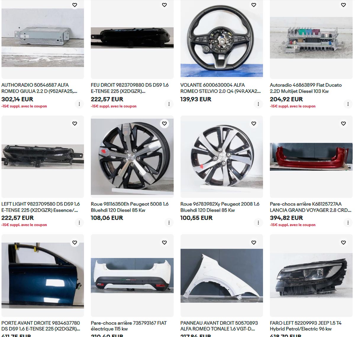 Beim Durchstöbern des Ladens kann man sich des Eindrucks nicht erwehren, auf einem Autoschrottplatz zu stöbern - allerdings in einer digitalisierten und sorgfältig sortierten Version. Hier findet man alles: Stoßstangen für den Jeep Renegade, Felgen für den Fiat 600 Hybrid, Rückleuchten für den Peugeot 308 oder Lenkräder für den Alfa Romeo Stelvio. Selbst speziellere Teile wie Autoradios, Karosserieverkleidungen oder elektronische Bauteile sind erhältlich.