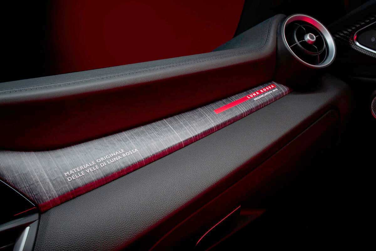 Inside, the Luna Rossa universe continues with special Sparco seats and, above all, a highly symbolic detail: a thin layer of genuine Luna Rossa sail integrated into the dashboard.