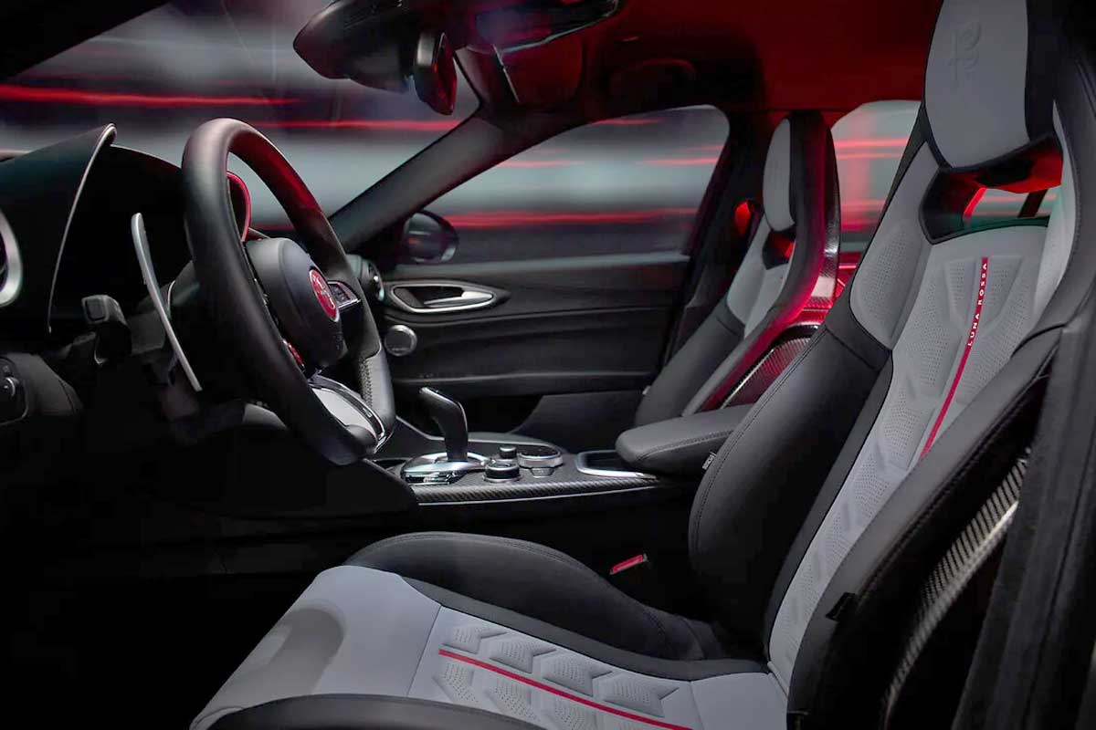 If the Giulia Luna Rossa had to be summed up in one word, it would undoubtedly be "efficiency". Alfa Romeo announces the most aerodynamically efficient Quadrifoglio ever conceived. The new carbon kit isn't about visual effect: it's entirely designed to generate stability at very high speeds. At 300 km/h, the Italian sedan develops around 140 kg of downforce, almost five times more than the standard Giulia Quadrifoglio. Under the hood, the legendary 520 hp, twin-turbocharged 2.9 V6, combined with a mechanical self-locking differential, is no surprise.