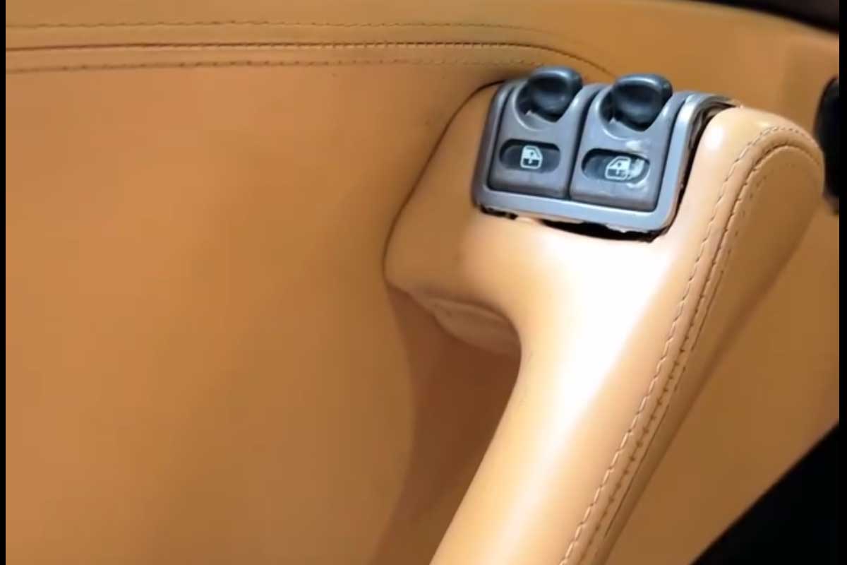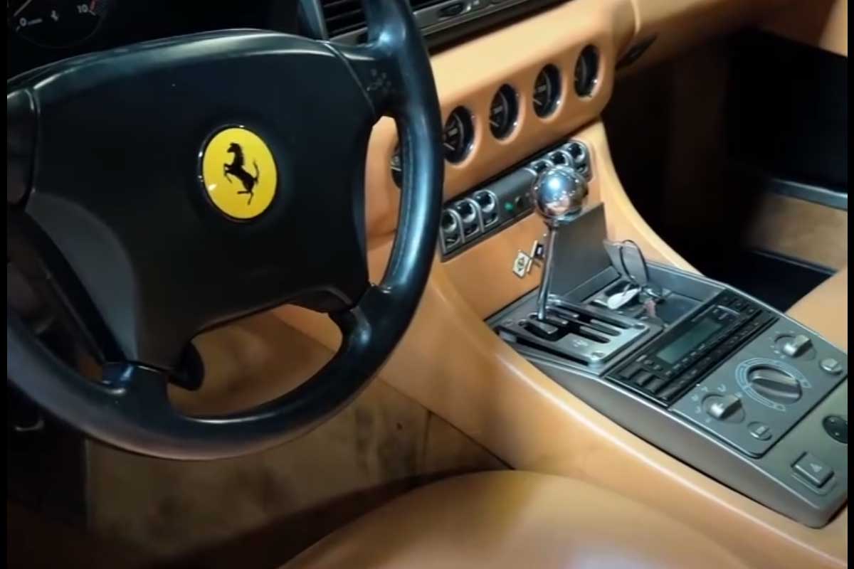 Unsurprisingly, the cosmetic condition of this Ferrari 456 GT betrays its intensive use. The car has been repainted, but without removing the windows, leaving visible masking lines. An operation which would have made it possible to replace the gaskets, now completely hardened by time. The interior is hardly more flattering. Doug Tabbutt speaks of a "truly horrible" interior, going so far as to ironize the state of the seats, which are heavily dyed, with traces of overspray visible even on the seatbelts. Interior trim is sometimes ill-fitting, some trim pieces are loose, and the rear deck leather has undergone significant shrinkage. Even the windows bear witness to this advanced age: rough adjustments, tired seals... defects not always directly linked to mileage, but reminders that this Ferrari has lived intensely.