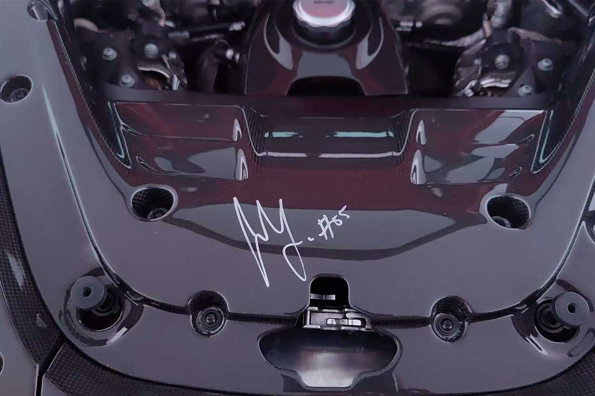 Technically and aesthetically, the car is beyond reproach. Rosso Corsa configuration, black interior, abundance of visible carbon, titanium exhaust and fastenings, forged wheels, full protective film, electric seats, premium hi-fi system, front and rear lift... Not to mention a manufacturer's maintenance cover until 2027. On paper, it's a very high-end SF90, exactly the kind of configuration you'd expect from a Ferrari ordered by an official driver. But the central element of this announcement lies elsewhere: Carlos Sainz's signature in the engine compartment.