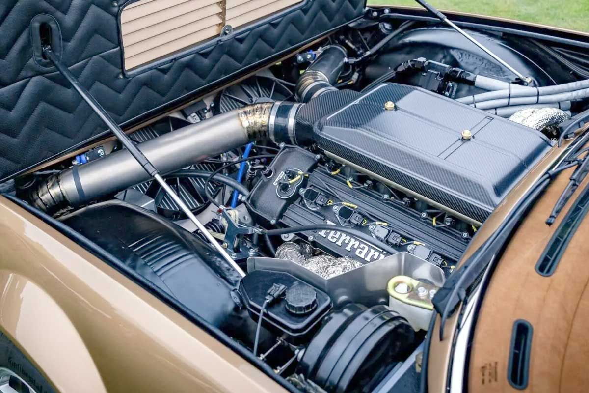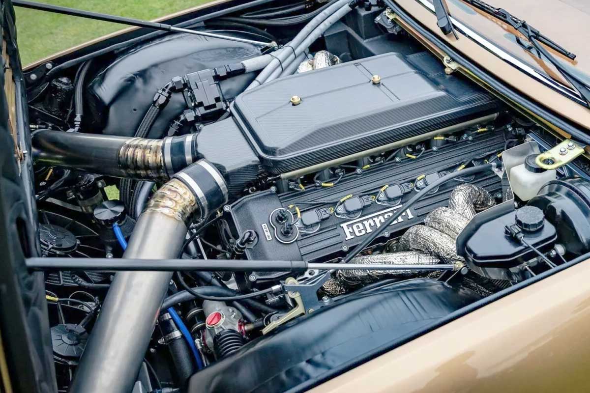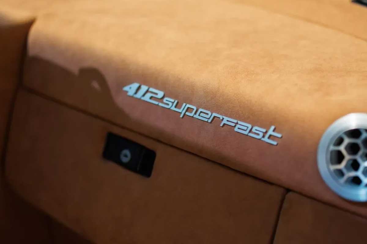 The heart of this transformation lies, of course, under the long front hood. Gone is the original V12. In its place, OMD has installed the 6.5-liter naturally-aspirated V12 from the Ferrari 812 Superfast, one of the most spectacular engines ever produced by Ferrari. But the integration was not limited to a simple swap. To reinforce the visual link with the 412 era, the engine is fitted with specific retro-style valve covers. Technically, the transformation is even more profound, with the intake and airbox made entirely of custom carbon. An almost artisanal approach, designed as much for performance as for aesthetics.