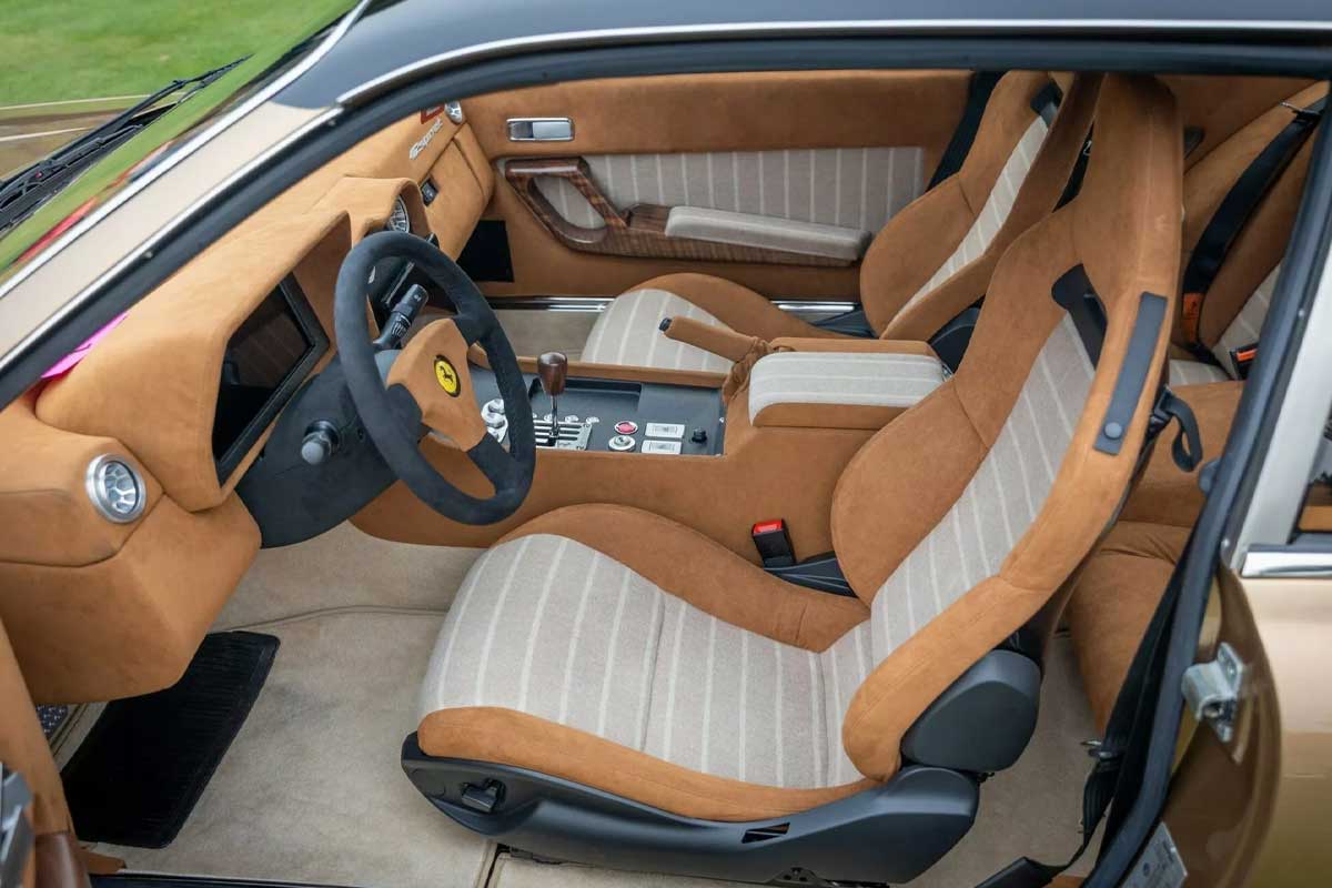 Visually, this Ferrari 412 restomod retains its grand coupé elegance, while adopting a distinctly more aggressive stance. The bodywork is in Superfast Gold combined with black, a nod to the Ferrari 812. The modifications are numerous: redesigned, more compact bumpers, wider fenders and 18" Brixton forged wheels, developed specifically for the project. The overall effect is one of modern presence without betraying the 412's DNA.