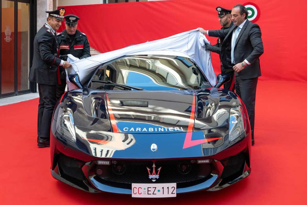 Officially delivered to the General Command of the Arma, the Maserati MCPura Carabinieri has been fitted with a specific layout: blue rotating beacons, "Carabinieri" signage on a black and red background, and a compartment adapted to the rapid transport of organs and blood bags.