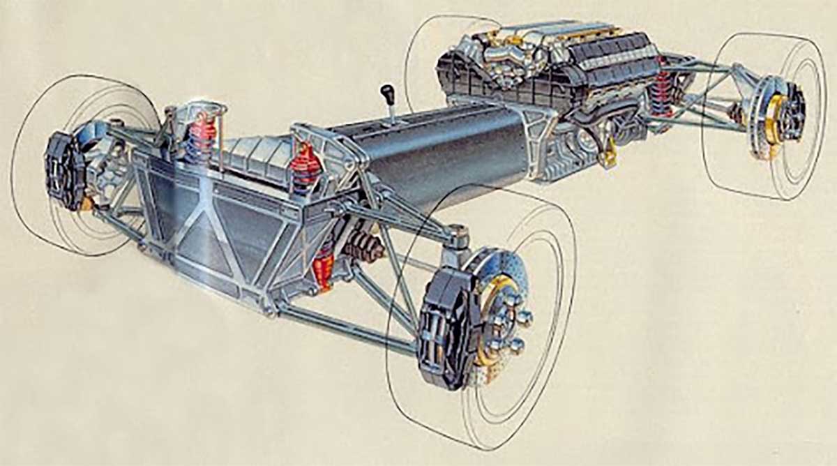 Another distinctive feature of the Chubasco is the absence of spoilers. The large rear spoiler seen in previous sketches was not present on the concept car. The monocoque, or body, is ideally designed as a floating cell connected to the chassis by shock-absorbing mounts that absorb vibrations from the engine, transmission, suspension and wheels, thus isolating the driver's compartment from the full frequency range of noise, vibration and torsion.