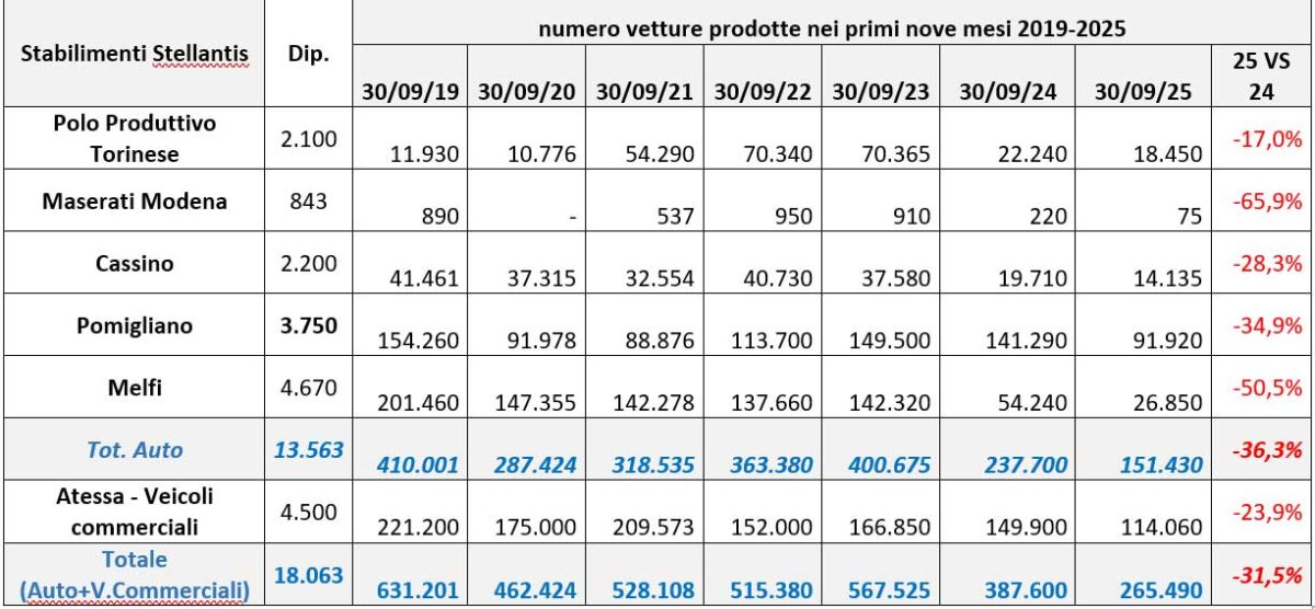 Whereas 2024 had already been described as a difficult year, 2025 looks even bleaker. In the first nine months, Stellantis produced 151,430 cars (-36.3 1TP3Q) and 114,060 commercial vehicles (-23.9 1TP3Q). At this rate, the year should close at around 310,000 units, a third less than the already low volumes of 2024. Almost half of the Group's employees in Italy are currently affected by short-time working arrangements.