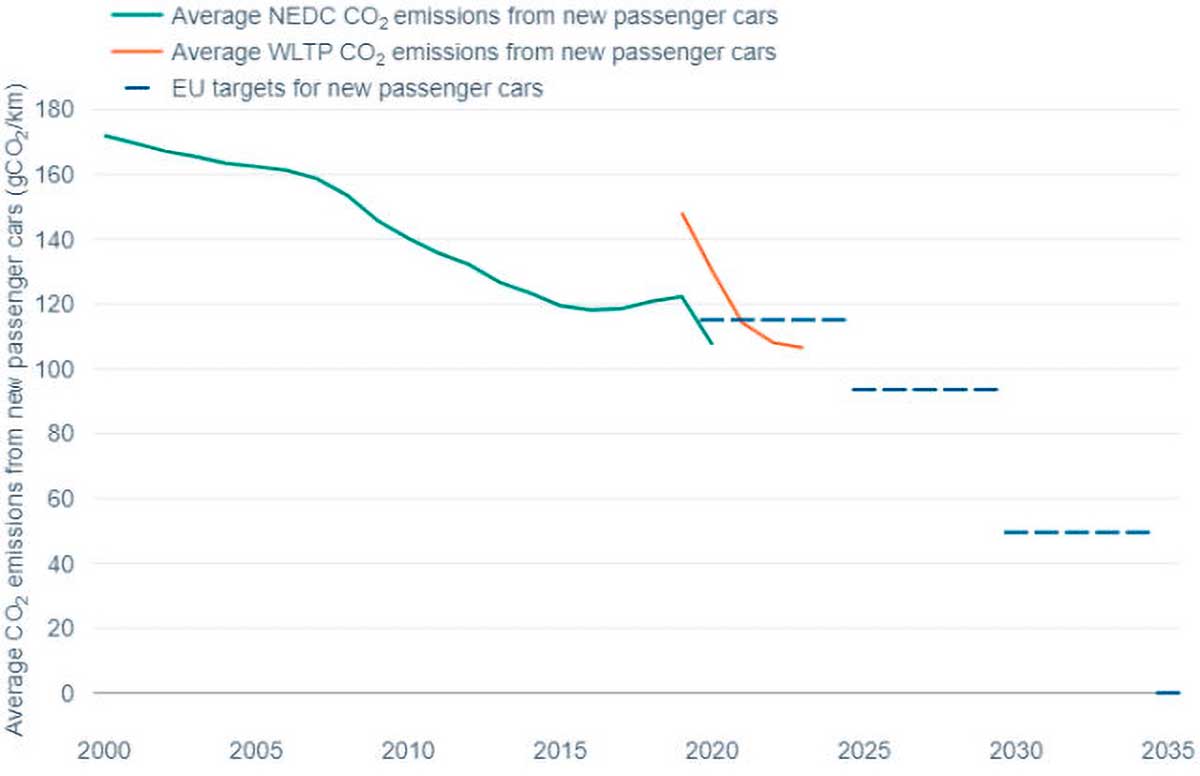 Because this decision by Brussels solves nothing of substance. It merely postpones the problem to 2026 and beyond, in a regulatory context that is set to become even tougher. The emissions thresholds imposed on automakers continue to fall, with a clearly defined trajectory: around 93.6 g/km from 2025, then a reduction of 55 % by 2030, i.e. a target average close to 49.5 g/km. In other words, a virtually unattainable level for a group whose volumes are still largely based on combustion and hybrid models.