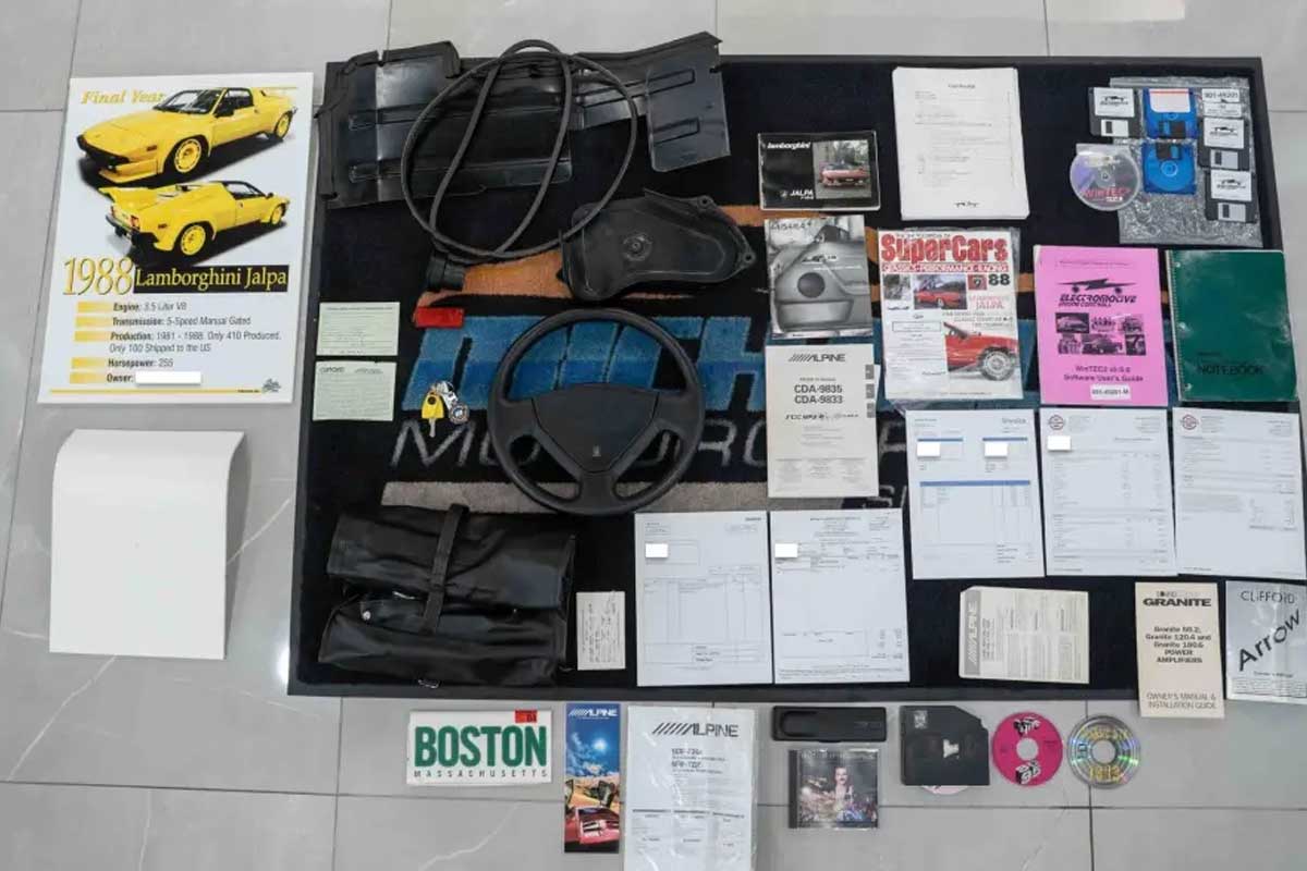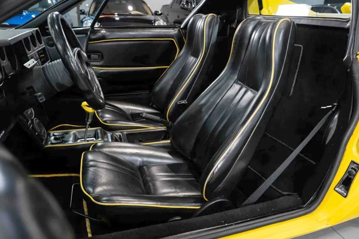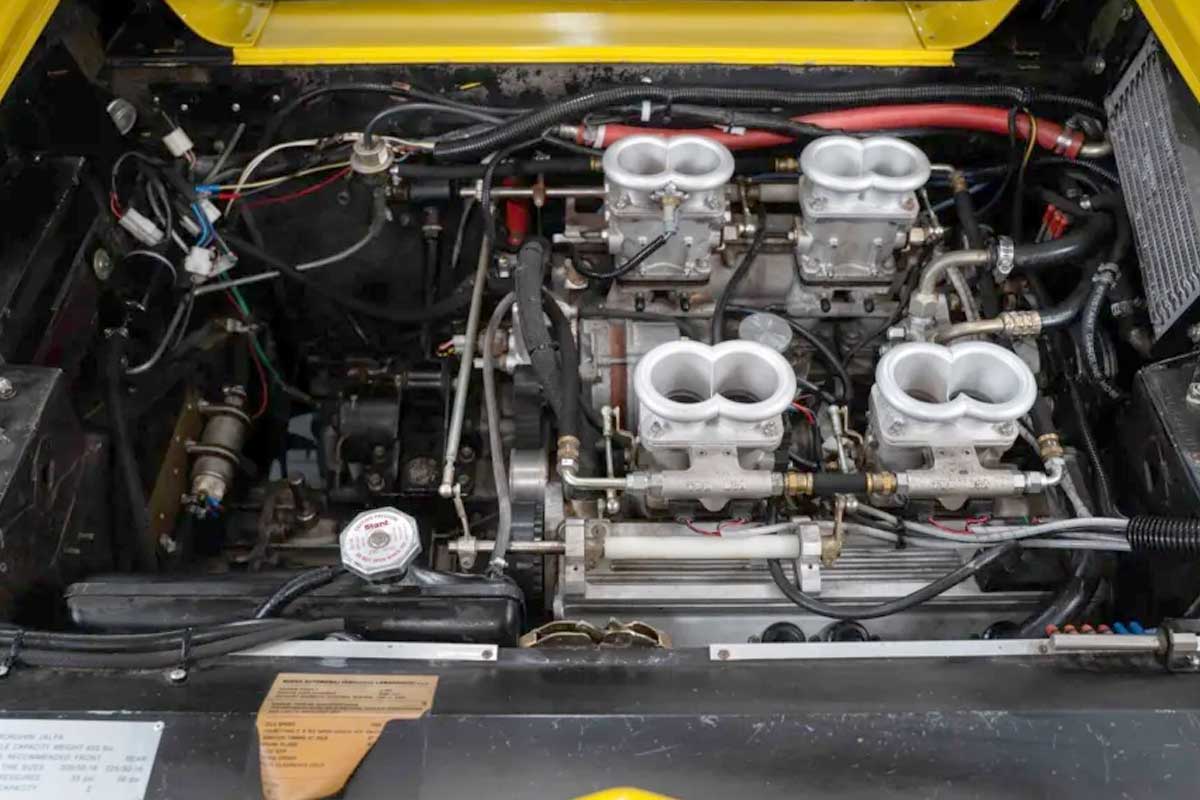 Este Jalpa de 1988 tiene apenas 5.900 kilómetros en el reloj. Una cifra casi indecente para un coche de más de 35 años. Destinado al mercado americano, es uno de los 100 ejemplares existentes en EE.UU., y de sólo siete coches pintados en este espectacular color Giallo Fly. Las llantas O.Z. del color de la carrocería, el interior negro con costuras amarillas, el pomo MOMO a juego e incluso las alfombrillas de la marca dan fe de una configuración especialmente deseable. El coche se acompaña de sus herramientas, documentos originales, un Carfax en blanco y un serio historial de servicio.