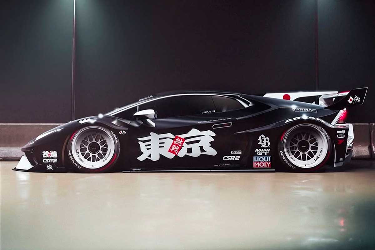 Fundada por Kato-san, Liberty Walk se ha consolidado como uno de los nombres más reconocibles del tuning japonés. Su filosofía es sencilla: exagerar las formas, ir al extremo y transformar supercoches ya de por sí espectaculares en coches de exhibición imposibles de ignorar. Este Huracán no es una excepción. A primera vista, parece salido de un universo paralelo. La carrocería, recubierta de un profundo negro satinado, sirve de telón de fondo a una original librea que combina gráficos blancos, toques de rojo y logotipos de los socios. Una identidad visual diseñada en colaboración con Blackfish Graphics, que refuerza aún más el aura underground y racing del coche.