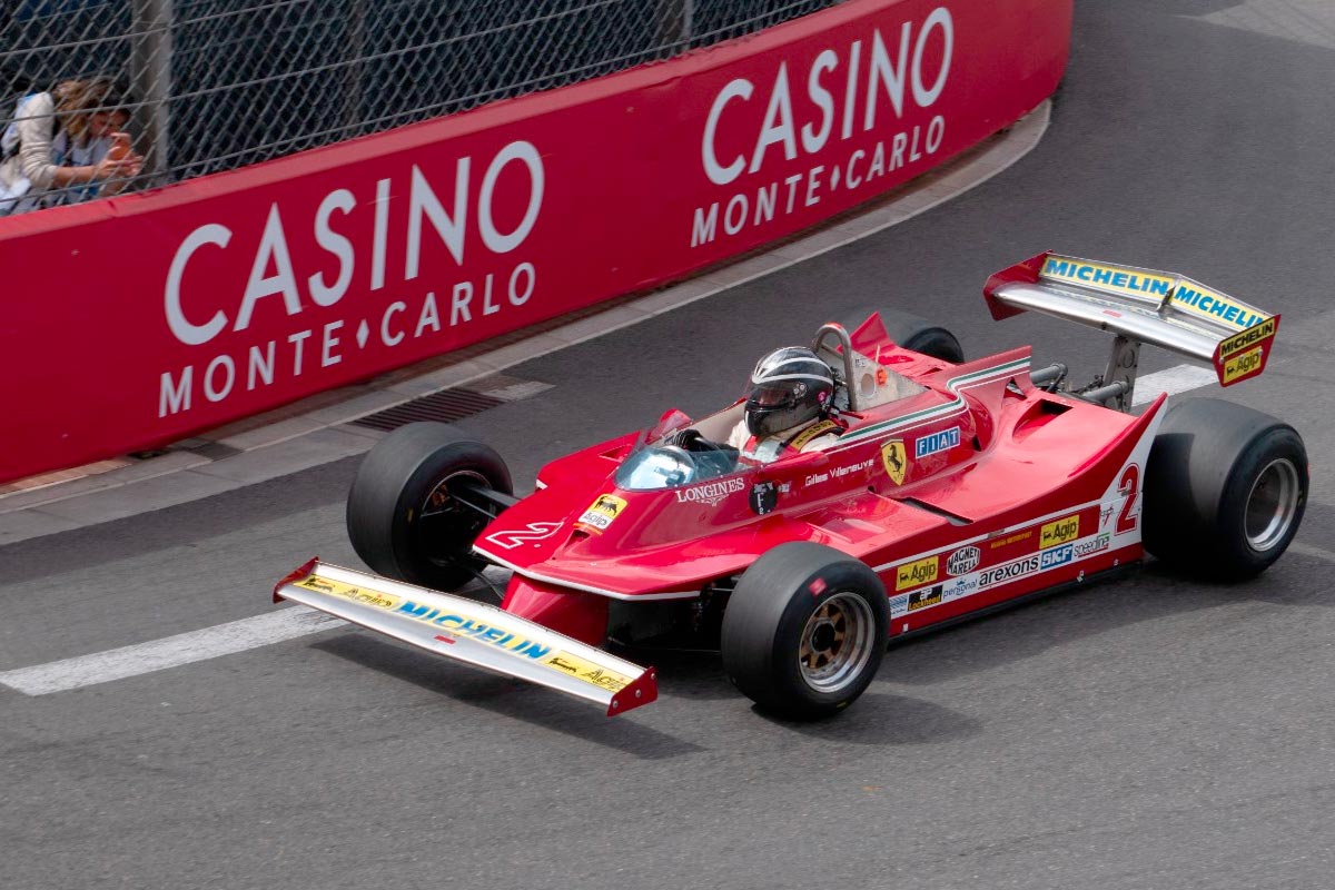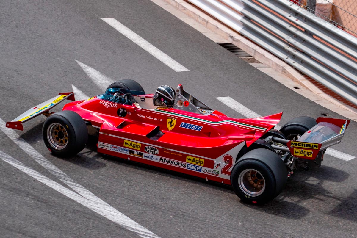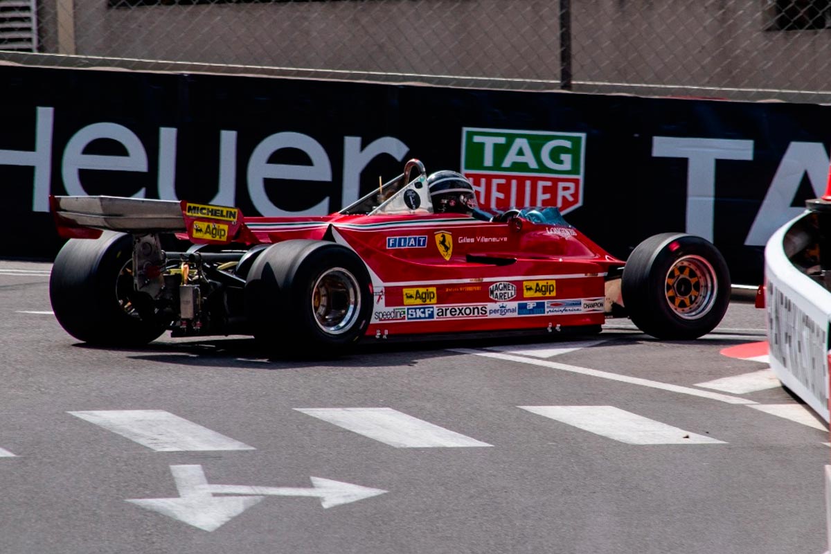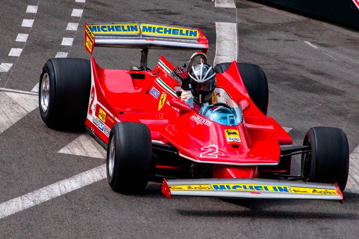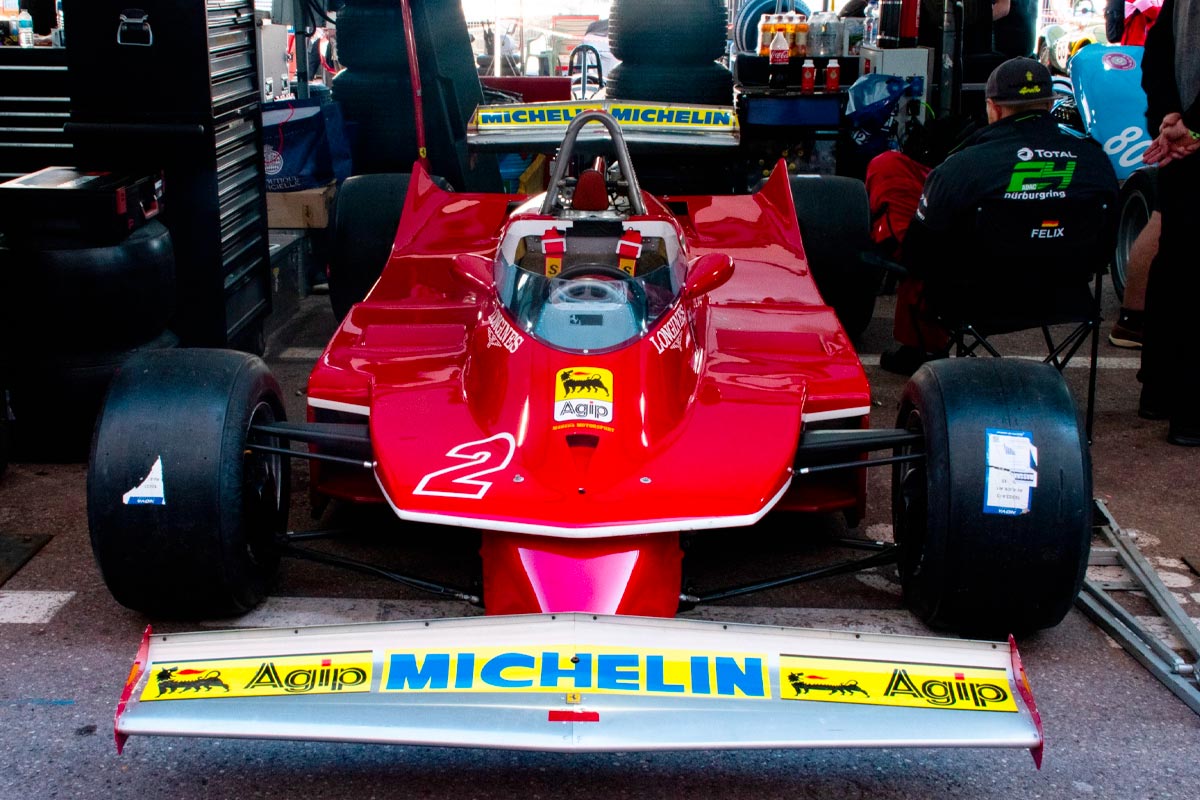 La série F, qui accueille les F1 à moteur 3 litres construites entre 1977 et 1980, se nomme “Gilles Villeneuve”. Il aurait donc été incongru qu’aucune voiture du canadien ne soit présente. Tant mieux, dans ce plateau dominé par des voitures anglo-saxonnes (Hesketh, Williams, Lotus, etc), une ex-Ferrari de Villeneuve était alignée : la 312 T5 de 1980, pilotée dans les rues de la Principauté par Juergen Boden.