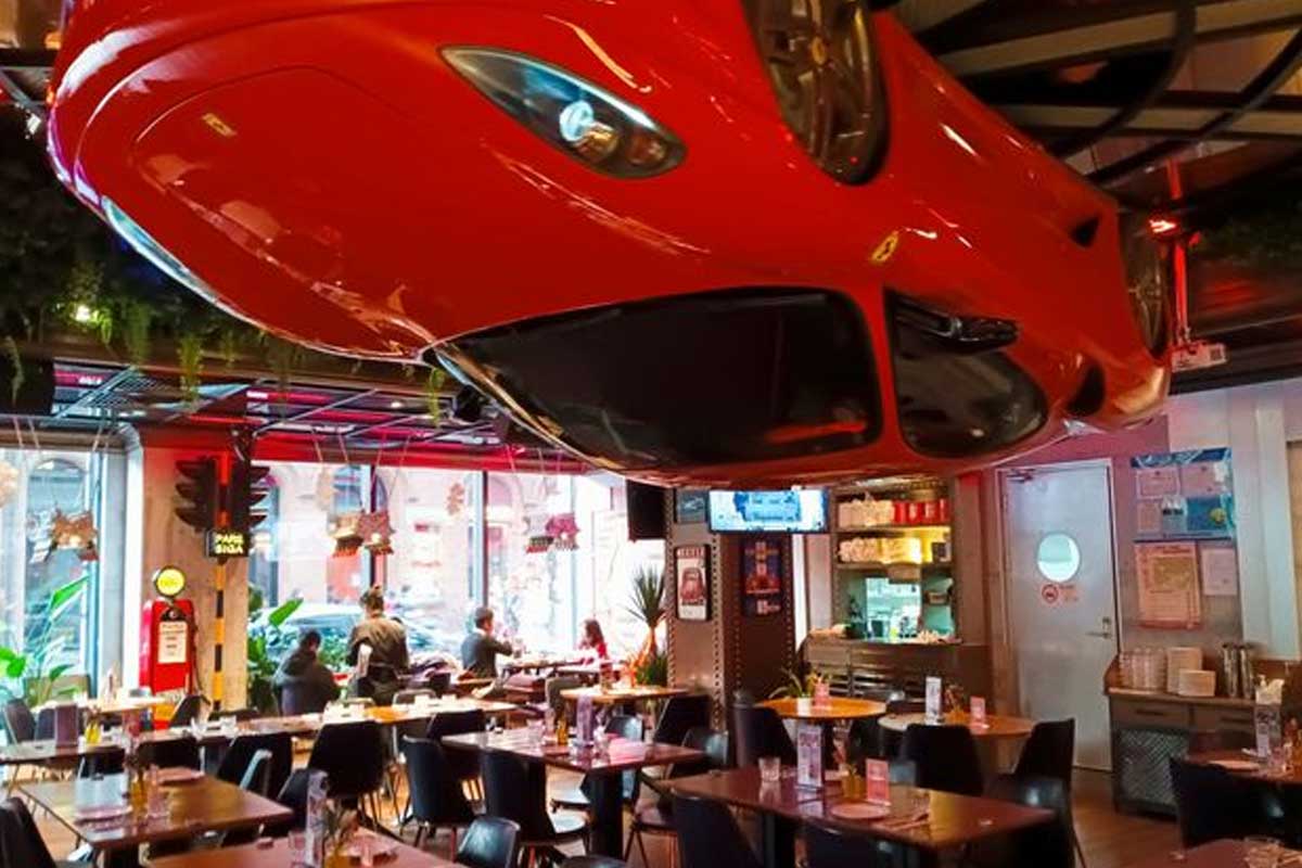 La Ferrari au plafond n’est que la pièce maîtresse d’un décor beaucoup plus vaste. Les murs seraient couverts de pièces mécaniques, d’éléments rappelant des ateliers automobiles et de créations sur mesure. Certains évoquent des luminaires en forme de pistons, du mobilier inspiré d’outils ou encore un bar évoquant la forme d’un bus. Si vous avez l’occasion d’y aller un jour, envoyez-nous des photos !