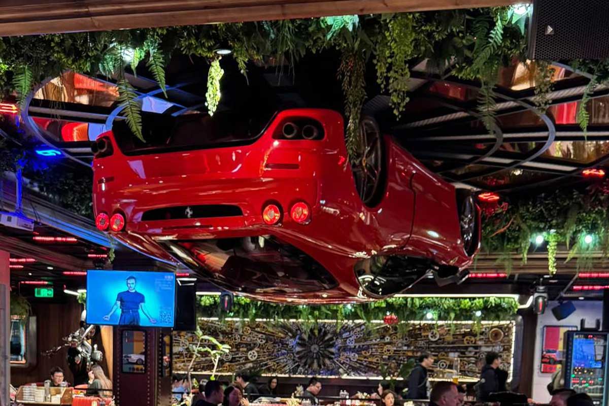 La scène paraît irréelle. Et pourtant, les photos partagées sur les réseaux sociaux ont rapidement confirmé la chose : une Ferrari F430 rouge est bel et bien fixée au plafond du restaurant. Loin d’être une simple pièce figée, la supercar italienne joue ici un rôle inattendu. Selon les témoignages de clients, la Ferrari tourne lentement sur elle-même, intégrée à un mécanisme d’horloge géant. Elle agirait comme une aiguille monumentale, marquant le temps qui passe. Mieux encore, l’installation émettrait un signal sonore toutes les quinze minutes.