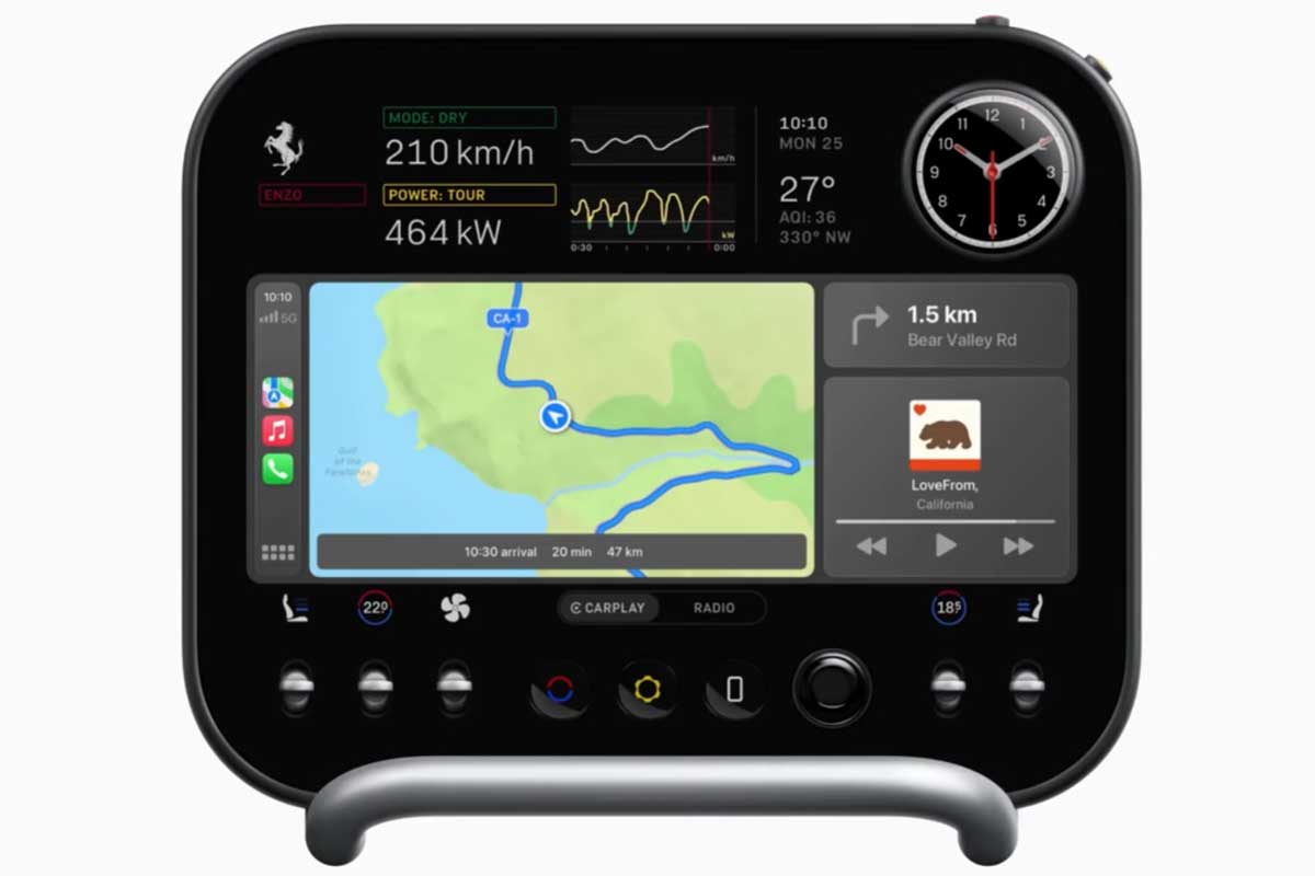 Au centre de l’habitacle trône un écran tactile de 10 pouces, mobile, monté sur une structure en aluminium qui sert à la fois de poignée et de repose-paume. Visuellement, la filiation avec l’iPad est évidente. Mais Ferrari insiste : cet écran n’est qu’un élément parmi d’autres. Les fonctions essentielles comme la climatisation, les réglages rapides ou les médias disposent toutes de commandes physiques dédiées. Chaque bouton a une texture et une résistance spécifiques, permettant de les reconnaître sans quitter la route des yeux. L’écran est réservé aux réglages plus profonds, à la navigation et à l’affichage d’informations secondaires.