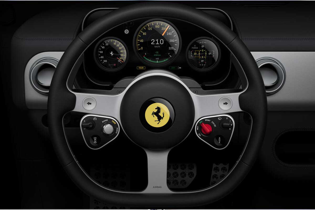 Le volant de la Ferrari Luce est sans doute l’un des éléments les plus symboliques de cet intérieur. À trois branches, fin, presque minimaliste, il s’inspire directement des anciens volants Nardi qui équipaient certaines Ferrari mythiques des années 1950. Un clin d’œil à l’histoire, mais sans nostalgie excessive. Entièrement usiné dans un seul bloc d’aluminium, il intègre deux manettino distincts : l’un dédié à la gestion de l’énergie et de l’autonomie, l’autre aux réglages dynamiques du châssis et du comportement. Les palettes, quant à elles, ne servent plus à passer des rapports, mais à contrôler manuellement le couple et la régénération au freinage, avec un retour magnétique pensé pour être aussi précis que satisfaisant.