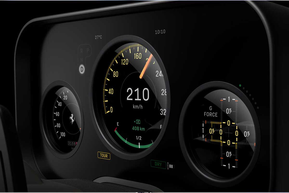 Même le traditionnel chronomètre Ferrari évolue. Il devient un instrument hybride, capable d’afficher une horloge, une boussole ou un timer de performance, avec des aiguilles mécaniques animées par une interface numérique.