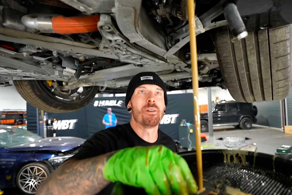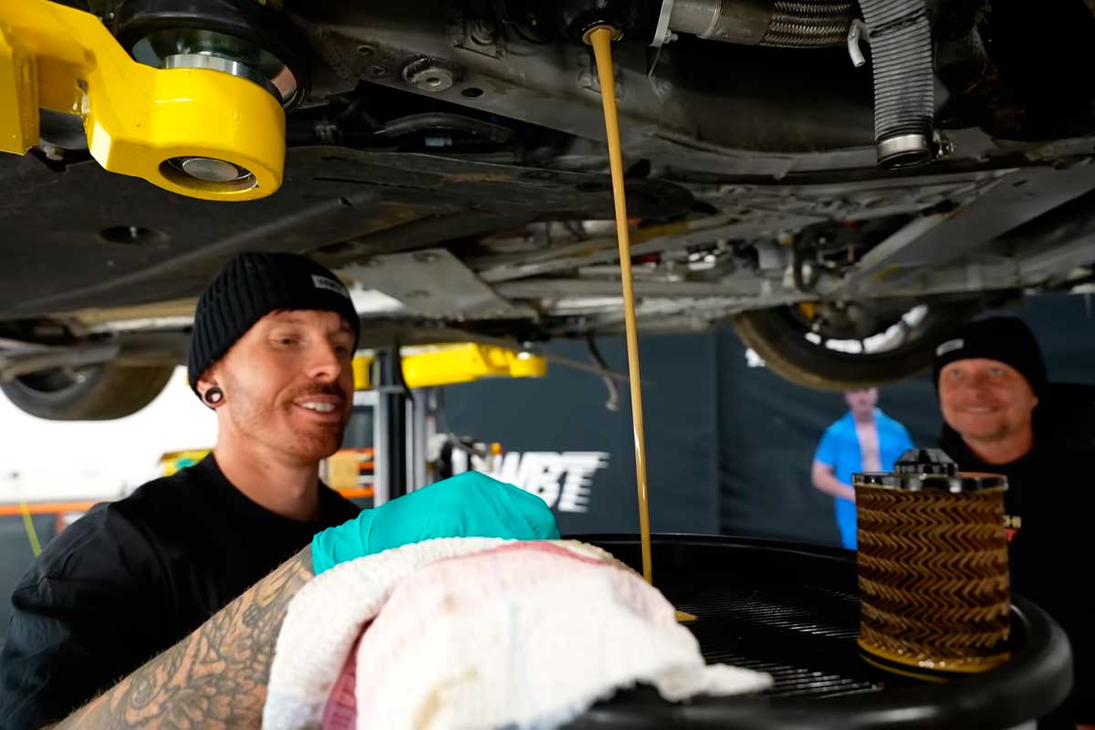 Plus tard, la voiture réparation de la voiture est bien avancée. Elle change même d’allure, avec une teinte verte assumée, un kit carbone agressif, et une transformation esthétique qui ferait oublier son état d’origine. Mais au moment de la mise sur pont et du “service” sérieux, l’huile est encore trouble. Après trois purges, elle devrait être redevenue propre. Là, non. Et quand l’huile reste laiteuse.