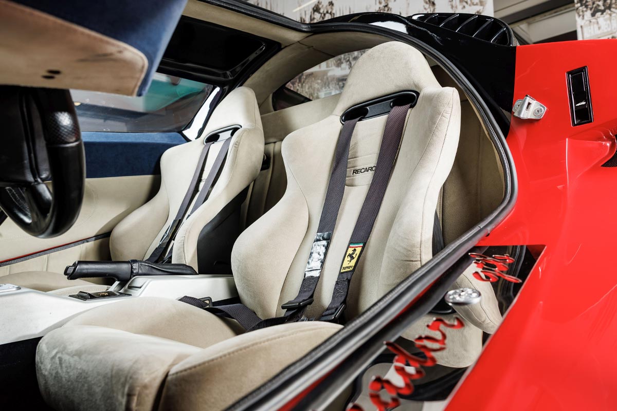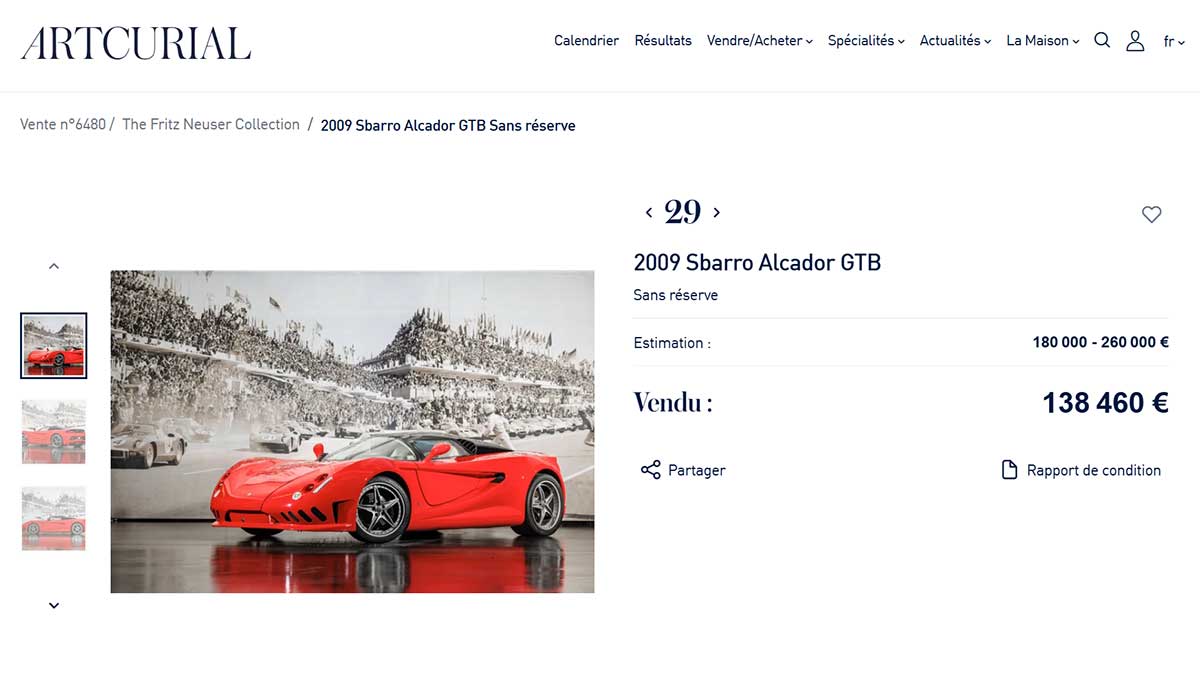 Elle a toutefois été repeinte en rouge au fil des années. Elle est aujourd’hui immatriculée en Allemagne, avec la date de première mise en circulation correspondant à celle de la Ferrari donneuse, soit 2001, tout en étant enregistrée comme Sbarro Alcador GTB. Selon la maison de ventes Artcurial, l’auto est en excellent état et conserve son intérieur spécifique blanc et bleu.