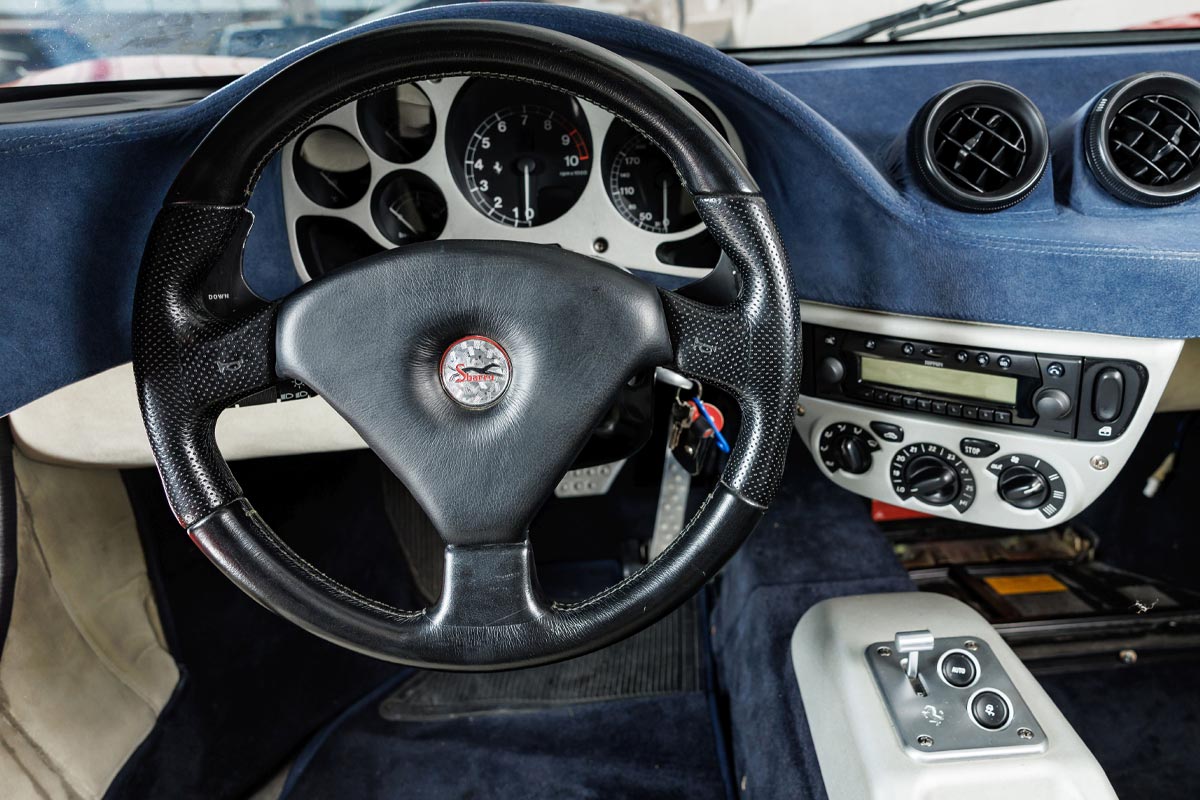 L’intérieur mélange également éléments d’origine Ferrari et touches spécifiques. On retrouve le volant, les compteurs analogiques et le tunnel central de la 360, mais le tableau de bord a été redessiné et orienté vers le conducteur. L’habitacle reçoit aussi une sellerie personnalisée avec des finitions en suédine bleue et cuir clair. La voiture offrait ainsi les performances d’une Ferrari tout en affichant un style totalement inédit.