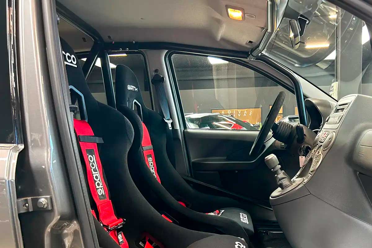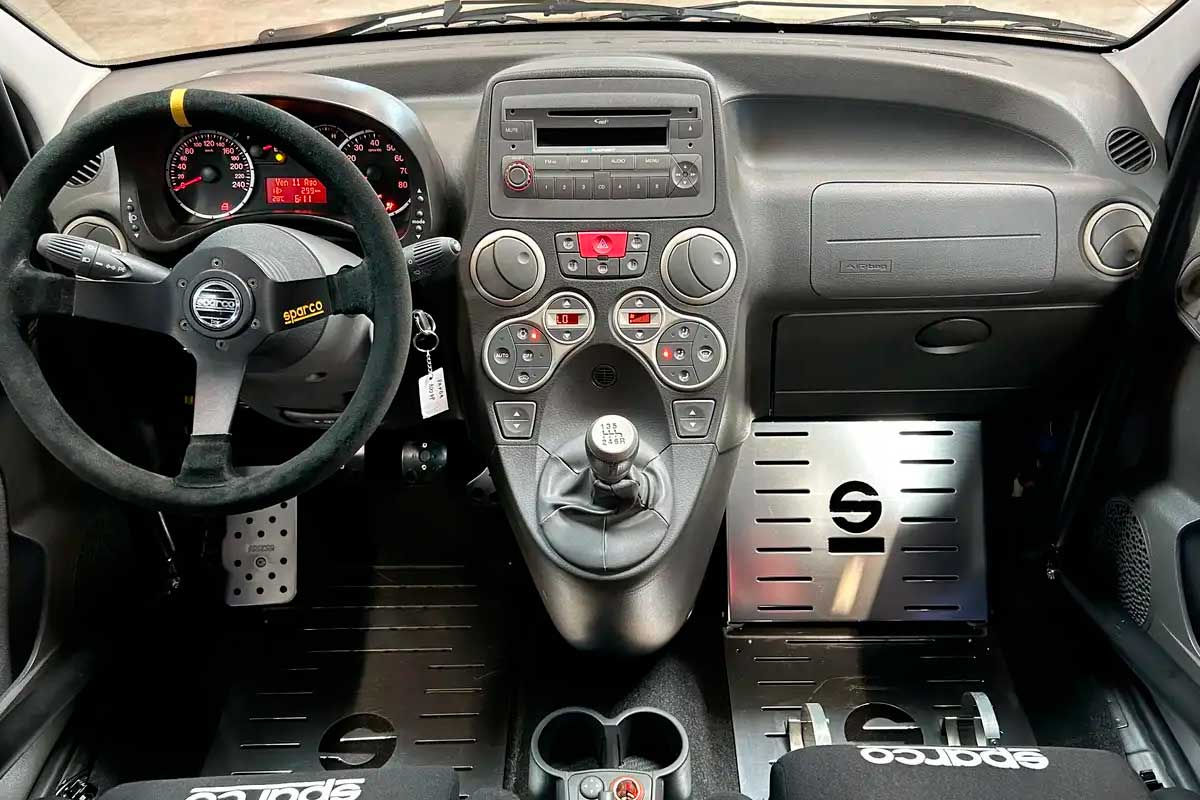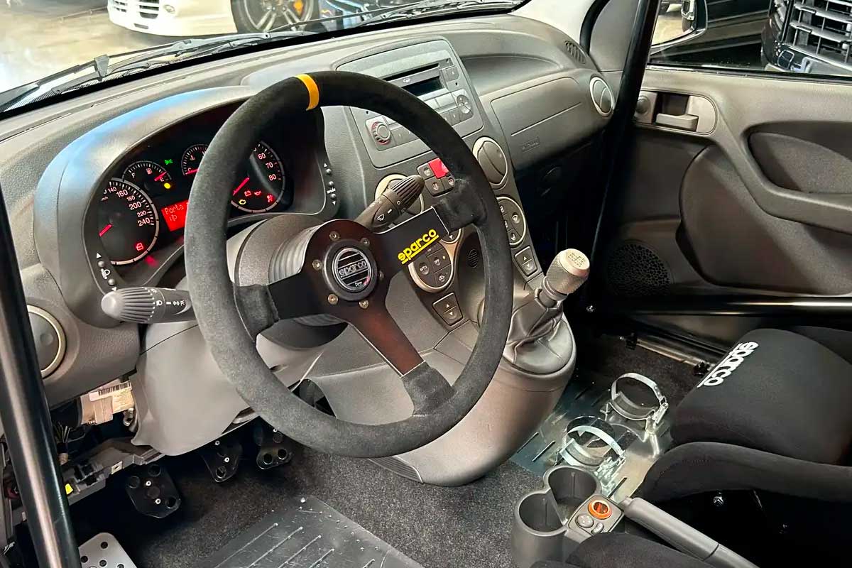 Ma non è tutto. Questa Panda 100 HP è stata accuratamente preparata per la pista, senza perdere la sua omologazione originale. All'interno troviamo un volante Sparco in Alcantara, sedili Sparco con cinture di sicurezza, roll bar, pedali in alluminio e persino vetri oscurati.
