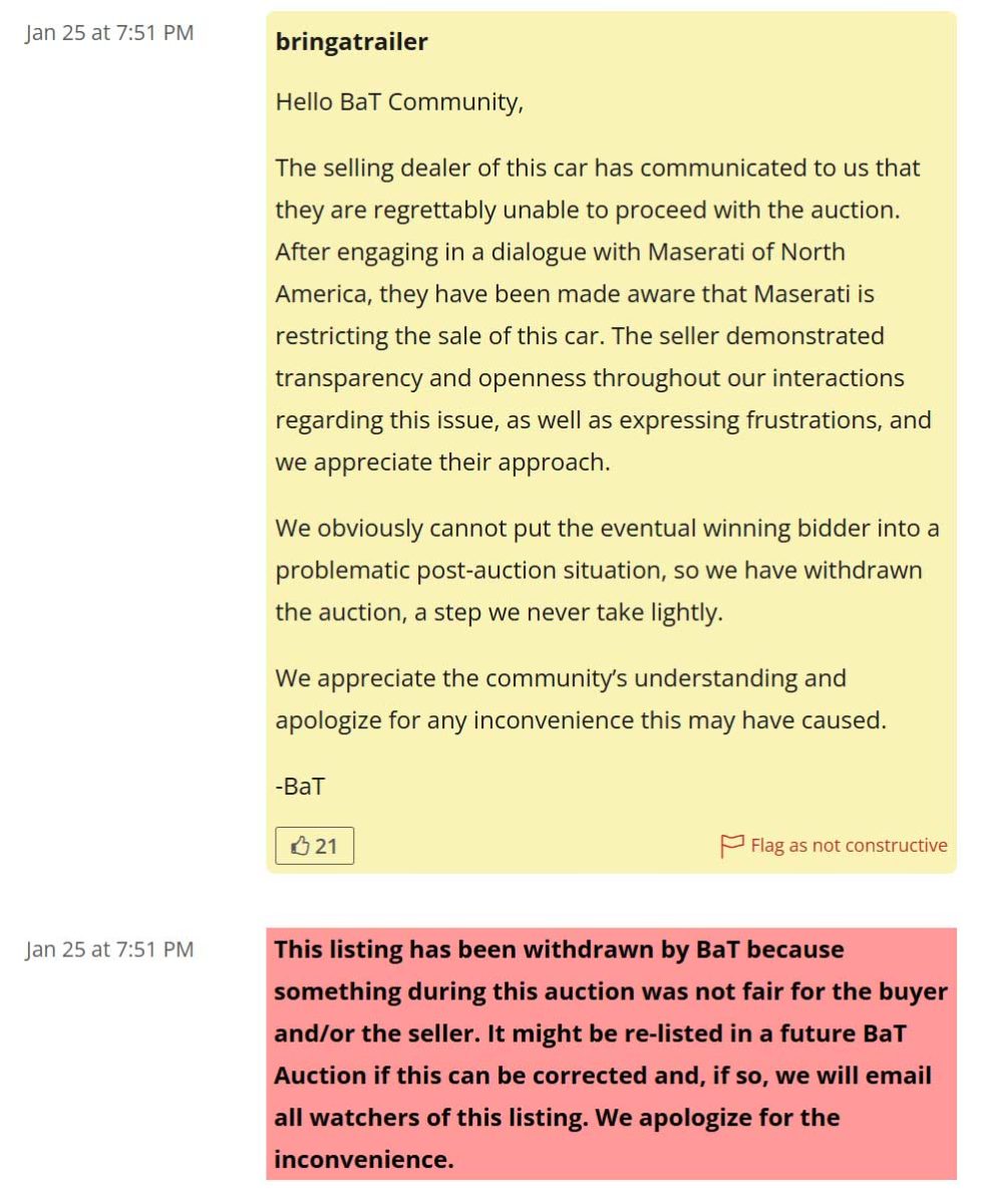 Alla fine di gennaio, la MCXtrema è apparsa su Bring a Trailer, una delle piattaforme di aste automobilistiche più popolari al mondo. L'interesse è stato subito travolgente. Le offerte sono aumentate, i commenti si sono susseguiti e il prezzo ha raggiunto i 751.000 dollari, quando mancavano ancora diversi giorni alla fine della vendita. Poi, senza preavviso, la vendita è stata interrotta. Il motivo? Maserati del Nord America è intervenuta per bloccare la rivendita del veicolo. In un messaggio pubblicato da Bring a Trailer, la piattaforma ha spiegato di essere stata informata che il costruttore italiano stava limitando la vendita di questa MCXtrema, senza fornire ulteriori dettagli. Per non mettere il potenziale acquirente in una difficile situazione legale dopo la vendita, l'asta è stata semplicemente annullata.