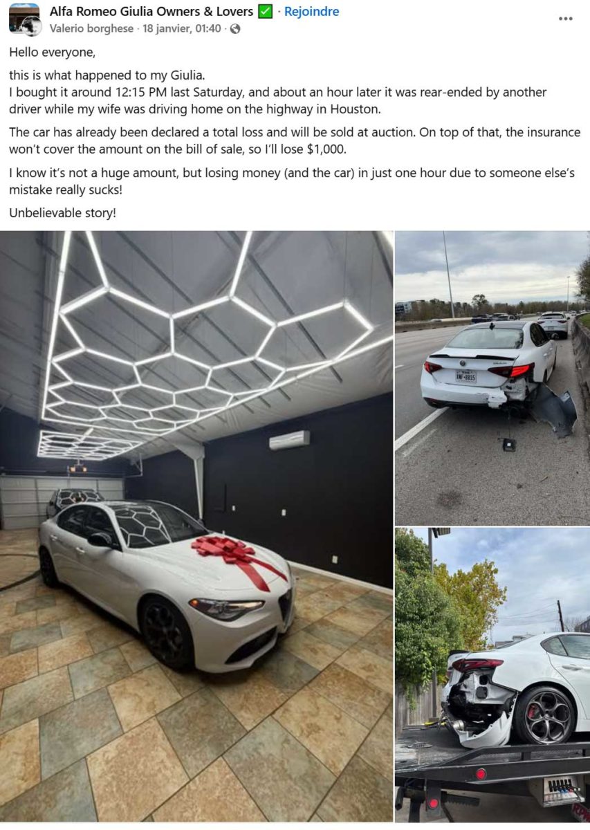アルフィストが購入当日にこんな目に遭うとは想像もしていなかっただろう。数日前、アメリカでは、テキサス州のあるオーナーがアルフィストを納車した。 アルファロメオ 12時15分頃のジュリア。イタリアン・スポーツ・サルーン、おそらくヴェローチェのトリムで、まだ無垢で、重要な瞬間を示すかのようにボンネットに赤いリボンで象徴的に飾られていた。その1時間後、夢は悪夢に変わった。