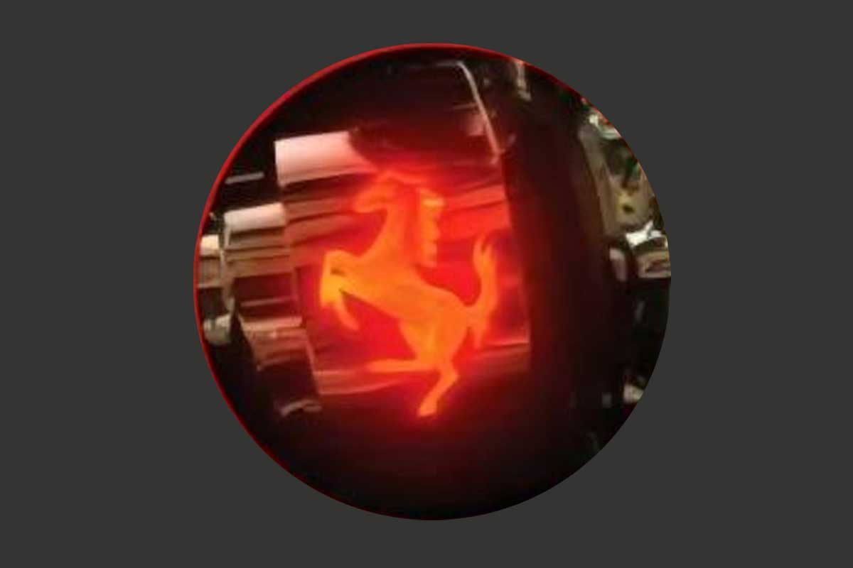 ターボヒートシールドには、ステンレスからレーザーカットされたカヴァリーノ・ランパンテを装着。低過給圧時は黒いスタッドがターボに見えますが、高過給圧時、ターボが熱くなるとカヴァリーノ・ランパンテは燃えるような赤に変わります。信じられない!