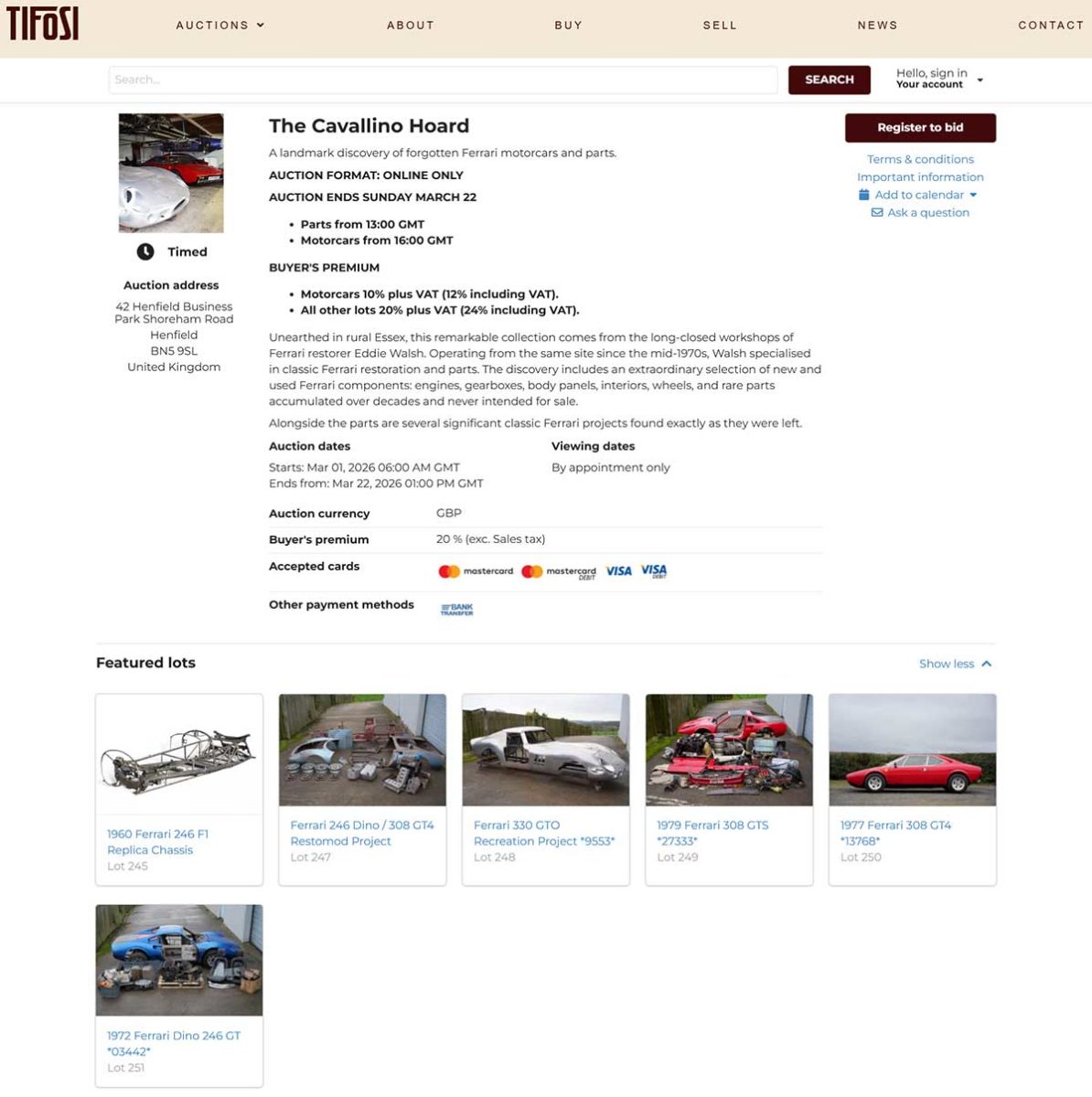 クルマもさることながら、最も印象的なのはパーツの多さだ。工房の箱や棚の中には、エンジン、ギアボックス、計器類、光学部品、ボディパネル、そして数多くのフェラーリの部品が眠っており、中には現在では入手困難なものもある。クラシック・フェラーリのレストアやコレクターにとって、このコレクションはまさに金鉱である。The Cavallino Hoard」と名付けられたこのセールは、Tifosi Auctionsによって3月22日までオンラインで開催される。コレクション全体では、600,000ポンド(約700,000ユーロ)を超える値がつく可能性がある。.