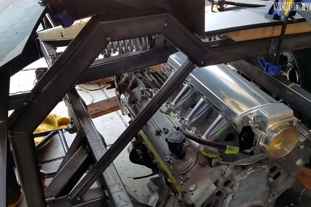 ランボルギーニにインスパイアされたボディワークの下には、自然吸気のV12はない。代わりにスターリング・バッカスが選んだエンジンは、シボレー・コルベットC5から流用した5.7リッターLS1 V8だ。ポルシェ911の6速マニュアルギアボックスと2基のターボチャージャーを組み合わせ、550馬力から600馬力を発生する。