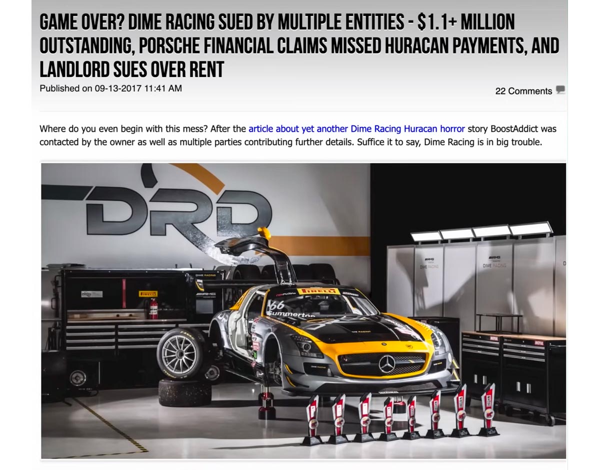 フラカンはラスベガスのランボルギーニに運ばれ、そこで1カ月間保管された。この間に、暴露されたことは山積みとなった。ダイム・レーシングは真面目なチューナーとはほど遠く、数々のいかがわしいことに関与していた。創業者には長い前科がある。会社は裁判にかけられ、工房はオーナーによって閉鎖された。.