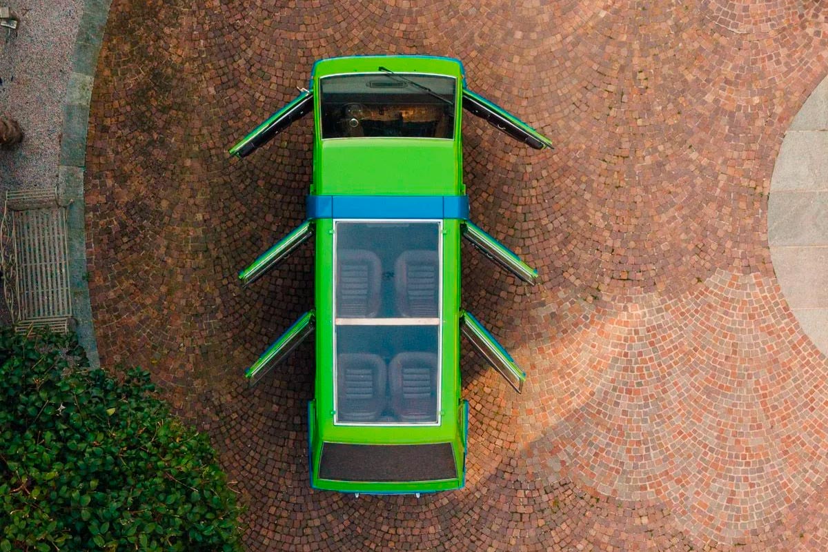 フィアット850 Tをベースにしたこのビジターバスは、従来のバンとは一線を画す。その立方体のシルエットには、根本的に異なるデザインが隠されている。各乗客に専用のドアがあり、6つの座席に全部で6つのドアがある。工場見学の際にアクセスしやすいように設計された、独創的であると同時に珍しい構成だ。.