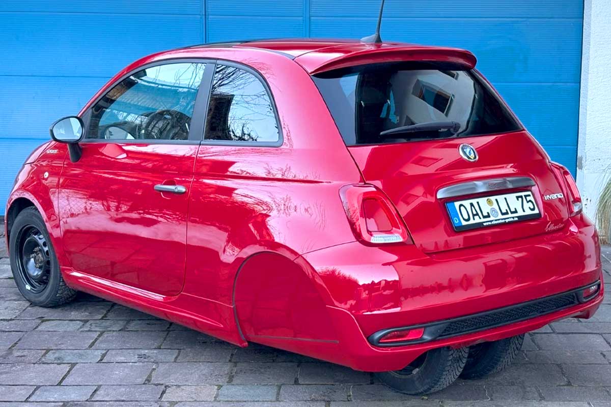一見したところ、この2021年型フィアット500には見覚えがある。赤の塗装、黒のシート表皮、フル装備、わずか18,400キロの走行距離。しかし、リアに近づくにつれ、視覚的なショックはすぐにやってくる。従来型のリアアクスルを想像するかもしれないが、2つの小さなホイールが非常に接近し、ほとんど接着されているのだ。