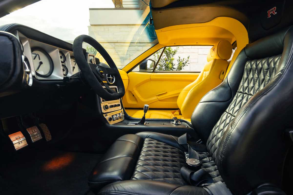 ひと目見ただけで、このパンテーラがもはや同じカテゴリーではないことがわかる。もともとパンテーラは、イタリアンデザインとフォードのメカニックを融合させたものだった。それから50年以上を経て、リングブラザーズは5,000時間を超える作業の成果として、このパンテーラを根本的に異なる生き物へと変貌させた。ボディワークは完全に平滑化され、幅が広げられ、近代化され、パネルは手作業で再加工され、カーボンのタッチで昇華されている。グラスリットの「イエローライン」ペイントは、ほとんど発光するようなイエローで、新しいプロポーションを際立たせ、クルマ全体にほとんど非現実的な存在感を与えている。