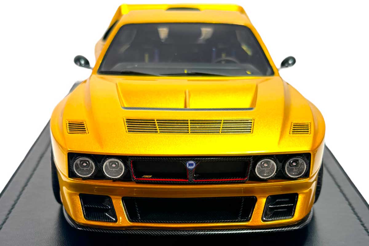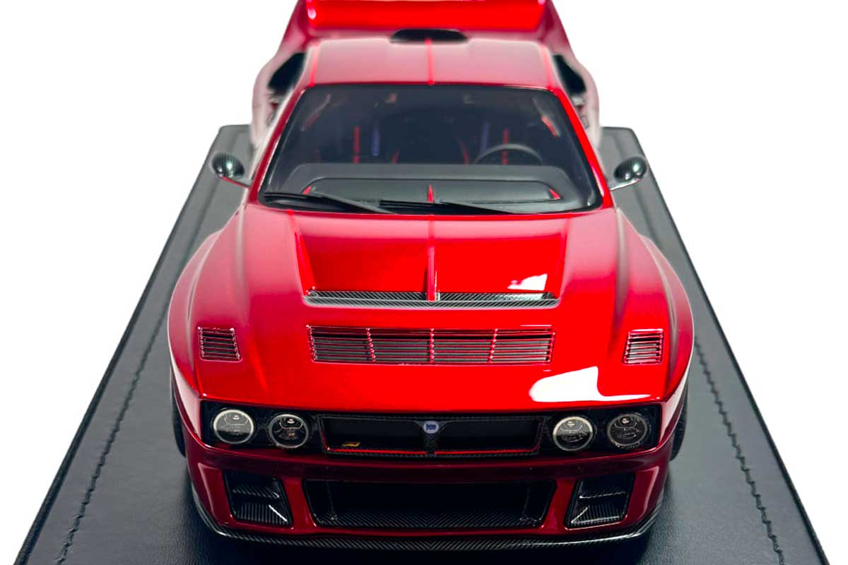 Cette EVO38 est réalisée en résine, un choix assumé qui permet une finesse de reproduction supérieure, au détriment des ouvrants. Le résultat est visible à l’intérieur : instrumentation rétro, sièges baquets, ambiance racing et même une vue sur le moteur en position centrale grâce à une partie transparente. On retrouve ainsi, en miniature, l’esprit théâtral de l’EVO38, cette voiture où la mécanique fait partie du spectacle, jusque dans l’habitacle.