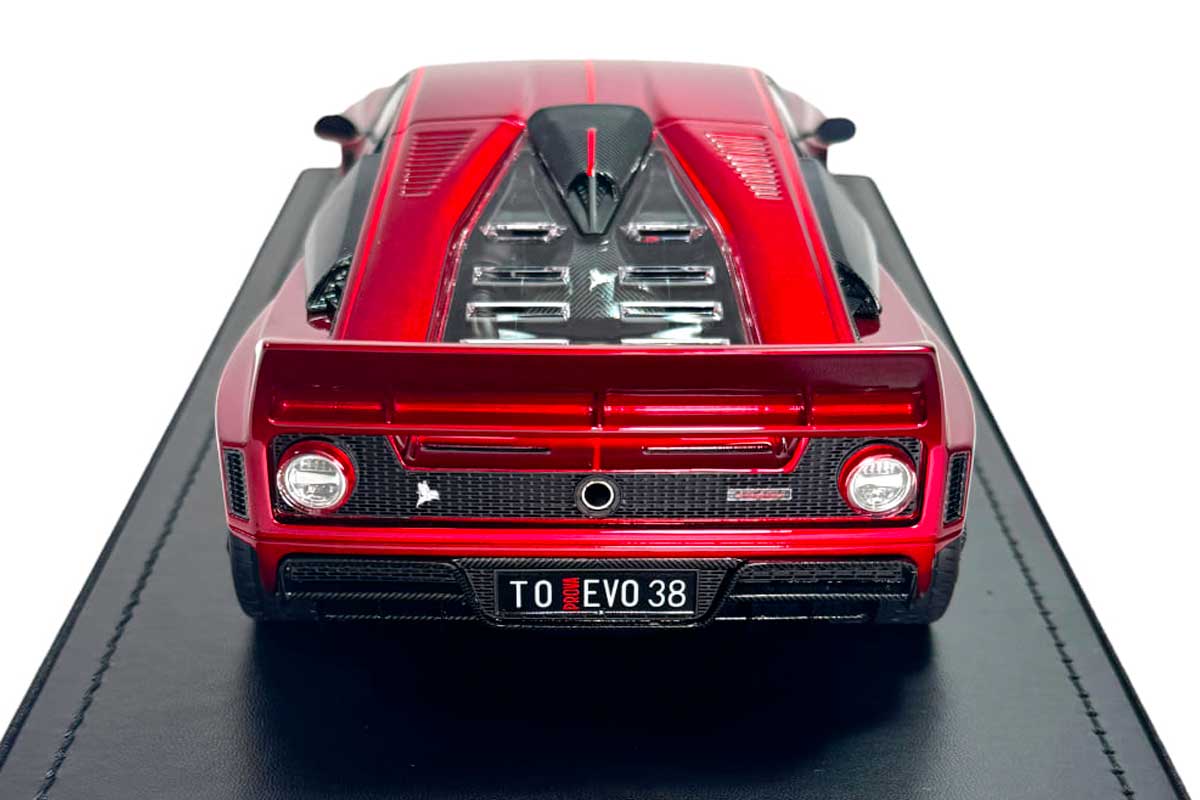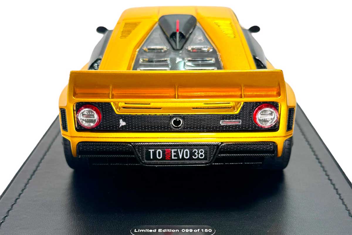 Cette EVO38 miniature est proposée en deux teintes, Metallic Yellow et Metallic Red, directement inspirées des configurations vues sur les premiers exemplaires du restomod. Les jantes typées compétition, chaussées de pneus Pirelli P Zero miniaturisés avec leurs marquages rouges, renforcent encore le lien avec la version grandeur nature. Même à cette échelle, l’EVO38 conserve cette aura de voiture de course homologuée pour la route.