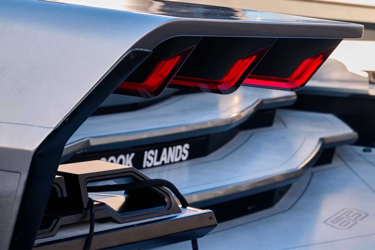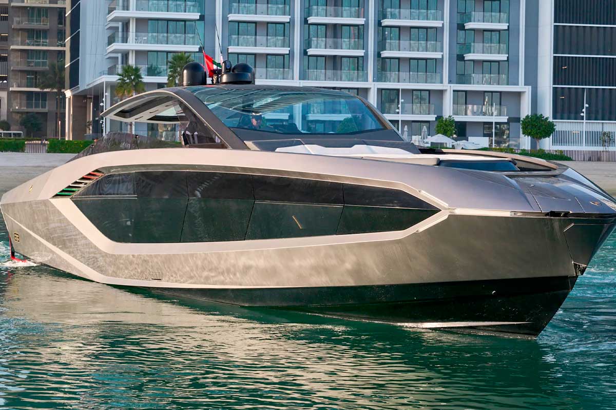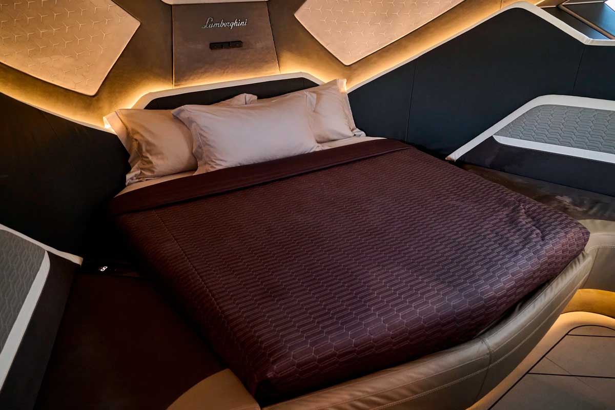 Le yacht dispose également d’équipements haut de gamme rarement vus sur un bateau de cette taille : écran TV escamotable de 43 pouces, système audio Creston spécialement développé pour Lamborghini, navigation avancée avec cartographie tactile, sans oublier une cabine principale avec puits de lumière en forme de logo Lamborghini.