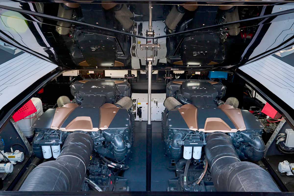 Sous son pont arrière, le Lamborghini 63 cache une mécanique tout aussi impressionnante que celle d’une hypercar. Le yacht est propulsé par deux moteurs V12 MAN développant chacun 2 000 chevaux, soit une puissance combinée de 4 000 ch. Une débauche de puissance qui permet à ce bateau d’atteindre 63 nœuds, l’équivalent de 117 km/h, faisant de lui l’un des yachts les plus rapides jamais produits. Avec une autonomie de 237 milles nautiques, ce monstre marin ne se contente pas d’aller vite : il offre aussi une vraie capacité de navigation.