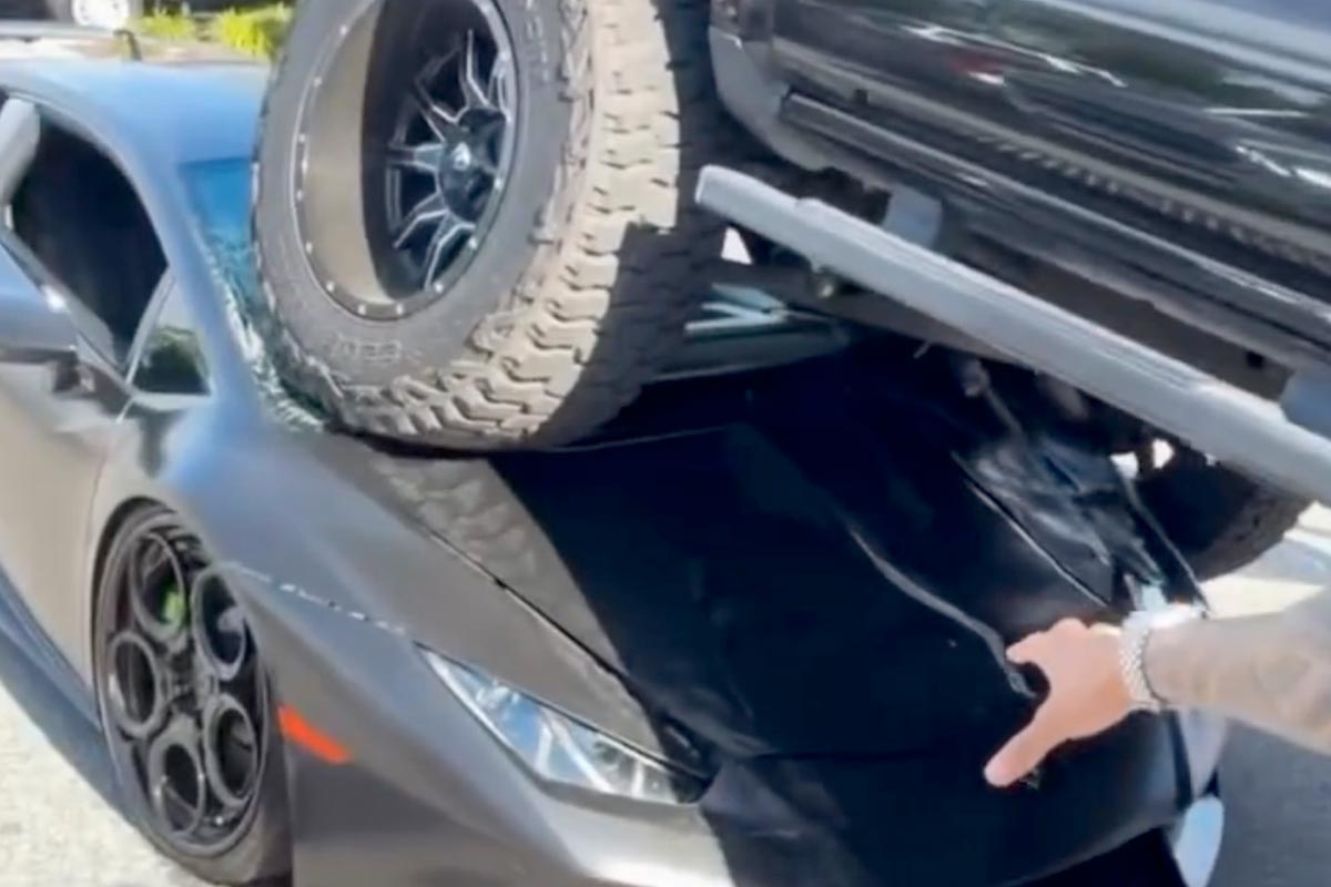 Ce qui suit dépasse le simple accrochage. Il n’y a ni freinage marqué, ni tentative d’évitement visible. Le choc se produit… puis le pickup continue. La Lamborghini est escaladée. Le véhicule grimpe sur son capot comme s’il franchissait un obstacle. Ce n’est qu’une fois immobilisée que la conductrice semble réaliser qu’un problème vient de survenir.