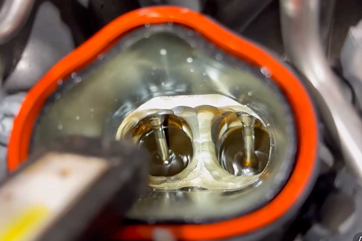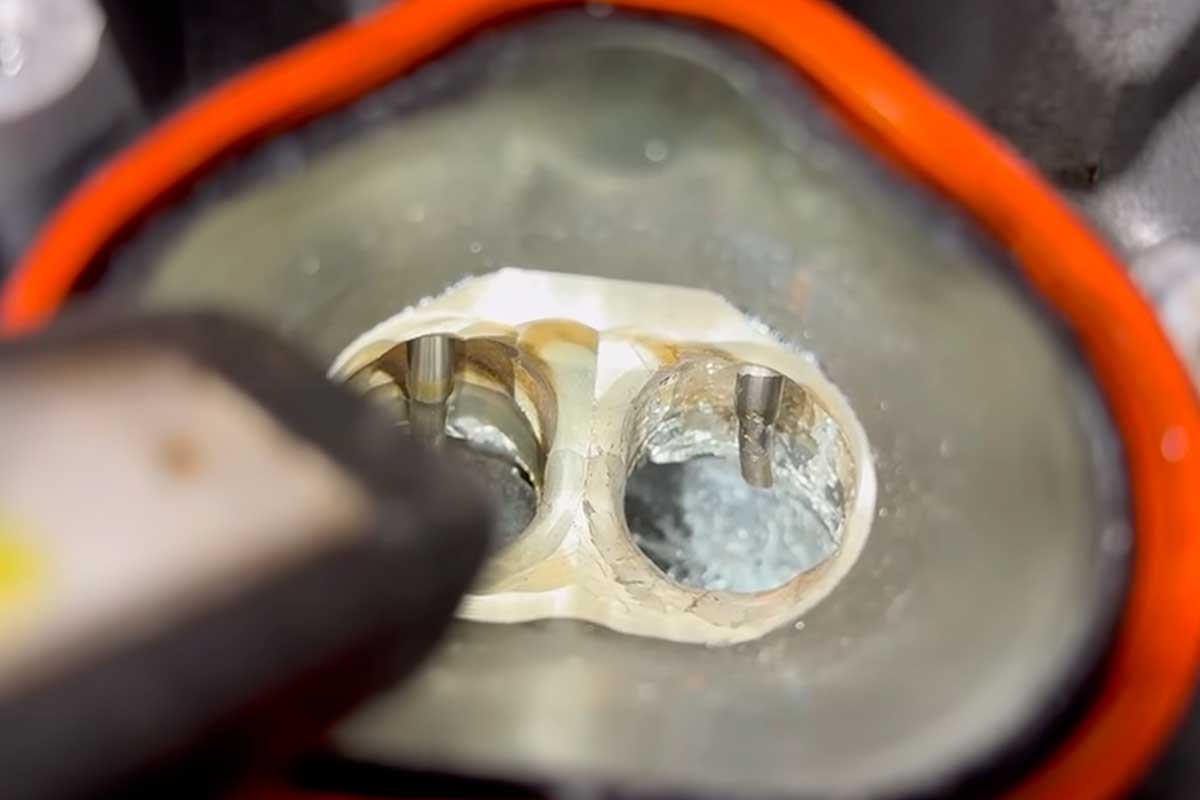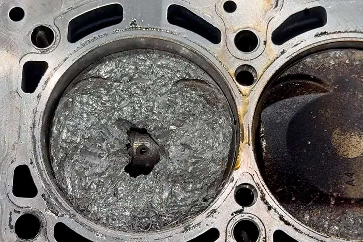 Puis une chambre de combustion si martelée par les débris qu’Eric dit ne pas se souvenir d’en avoir vu une dans cet état. Et deux soupapes ont disparu. Et si ces soupapes d’échappement avaient “réussi” à sortir par leurs propres conduits ?