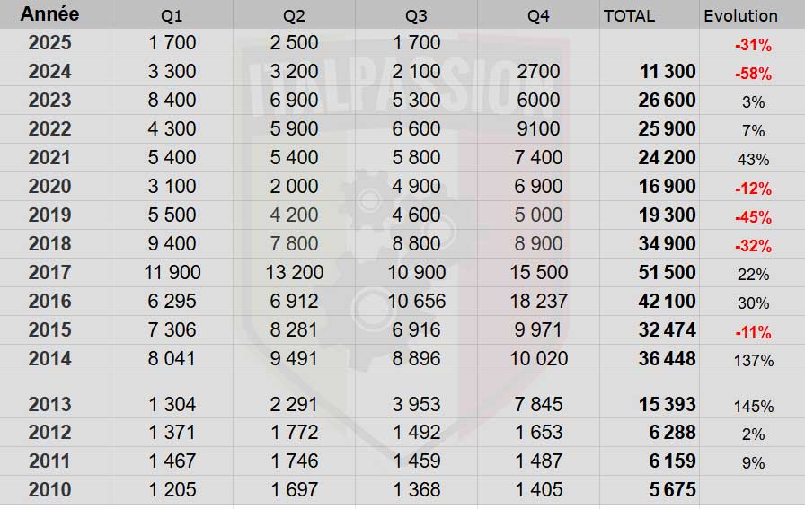 - Japon : 578 unités (-37 %), l’effondrement asiatique se poursuit sans rebond notable.