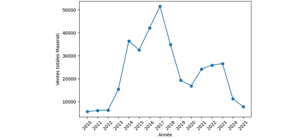 Le contraste est brutal : en 2017, Maserati dépassait 51 000 ventes annuelles. Huit ans plus tard, la marque vend presque sept fois moins de voitures.