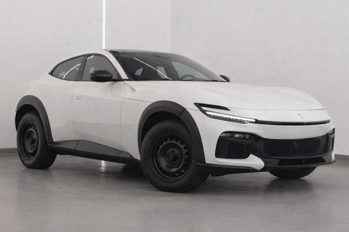 La Ferrari SF90 Stradale en de recente Ferrari 12Cilindri en de Ferrari Purosangue. Zelfs de SUV uit Maranello verliest plotseling alle visuele arrogantie met zijn zwarte kunststof en stalen wielen. Het is alsof Ferrari de optie 'utility pack' heeft aangevinkt.