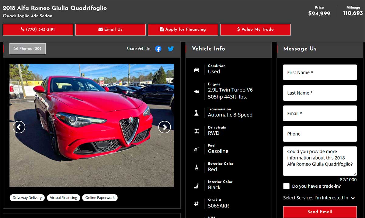 Ver um Alfa Romeo Giulia Quadrifoglio anunciado a 24.999 $ nos Estados Unidos é o suficiente para levantar uma sobrancelha. Estamos a falar de uma berlina de 510 cv, alimentada por um V6 twin-turbo de 2,9 litros, capaz de competir com as referências alemãs na pista e na autoestrada. E, no entanto, em Snellville, Geórgia, na North Georgia Auto Brokers, um modelo vermelho de 2018 está a ser oferecido a um preço mais próximo do de um automóvel compacto bem equipado do que de uma super berlina italiana. Tentador? Claro que sim. Mas a esse preço, há que colocar a questão: é uma pechincha ou um problema?