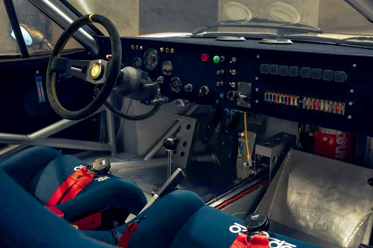 O interior remete-nos para a atmosfera de rali do início dos anos 80. O design interior, desde o volante até à instrumentação, é idêntico ao do Grupo 4 308 GTB homologado em 1976. Não existem portas USB, ecrãs digitais ou LEDs, apenas botões, interruptores e LEDs à moda antiga! Sentar-se no banco de balde e agarrar o volante adornado com o cavalo empinado é como recuar no tempo até à era dourada do Grupo 4. O equipamento completo de rali está implementado, com sistema de comunicação completo, sistema de extinção de incêndios, macaco, roda sobresselente, pistola de rodas e muito mais.