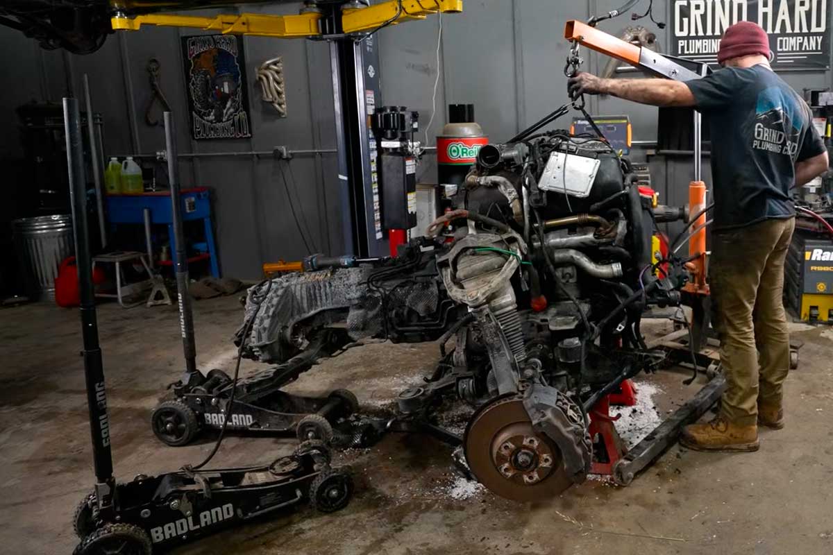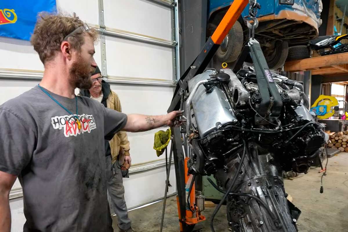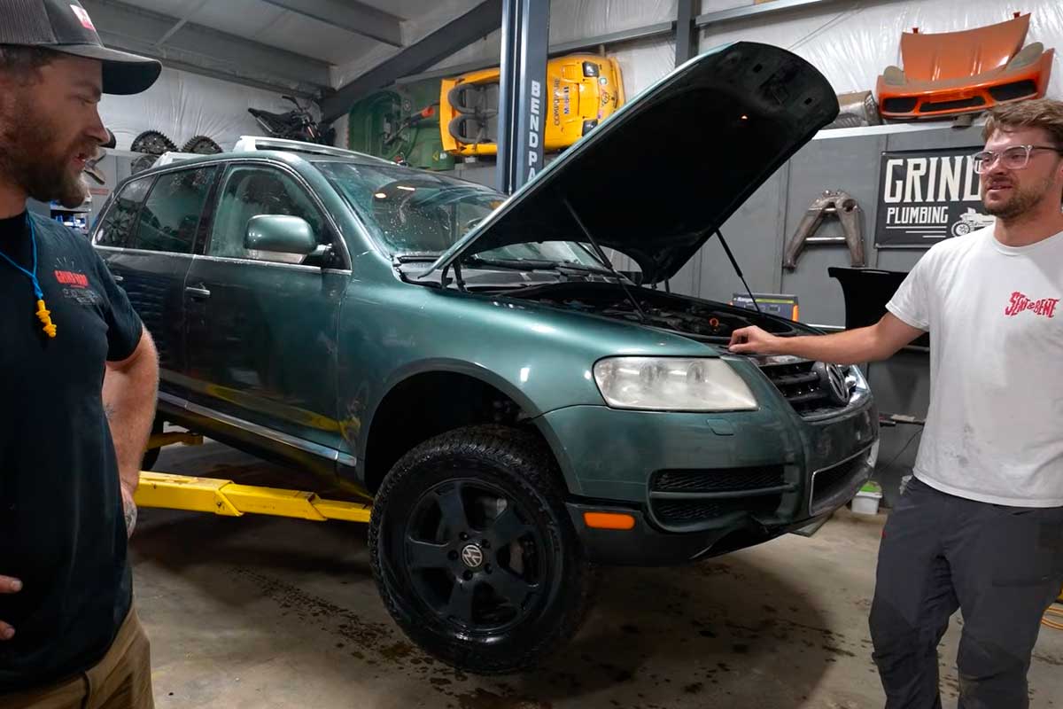Touareg'in sökülmesi otomobilin kendisinin bir yansımasıdır: aşırı. Ön kısım, birbirini takip eden plastik, takviye, radyatör, soğutucu ve kablo demeti katmanları halinde tam anlamıyla sökülüyor. Ön tarafın tamamı söküldükten sonra V10 ve şanzımanı kızaklarıyla birlikte çıkarılabiliyor. Motor daha sonra şanzımanından ayrılır, egzoz, EGR ve gereksiz aksesuarlar çıkarılır ve yüksek basınçlı temizleyici ile temizlenir. Ardından tartıdaki gerçek an geliyor: V10 350 kg (774 lb) ağırlığında! Hayal ettiklerinden çok daha ağır. Motorda tek bir kayış bile yok. Tüm aksesuarlar motorun arkasından dişlilerle tahrik ediliyor. Enjeksiyonlar kamlar tarafından mekanik olarak kontrol ediliyor. Her şeyin ne kadar iyi düşünüldüğünü keşfettiklerinde bir "mühendislik eseri "nden bile bahsettiler.