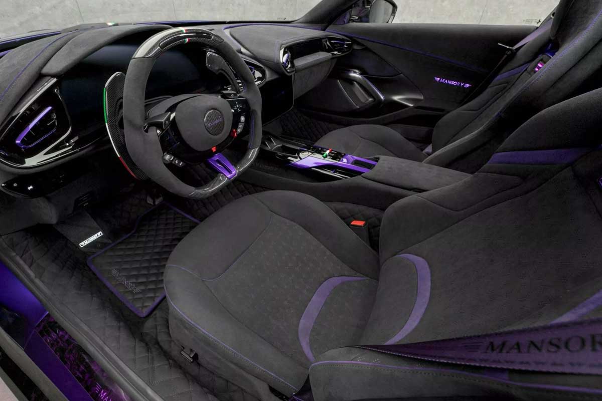 Mansory bu egzersize araçta da devam etmiş. Mor vurgular ve çok sayıda karbon eklentiyle zenginleştirilen gri Alcantara hakim. Tuner, Rolls-Royce tarzı LED aydınlatmalı bir tavan döşemesi bile sunuyor. Pedallar, spor direksiyon simidi, yastıklı paspaslar... tüm paket son derece kişiselleştirilmiş ve her müşteri kendi renklerini ve malzemelerini tanımlayabiliyor.
