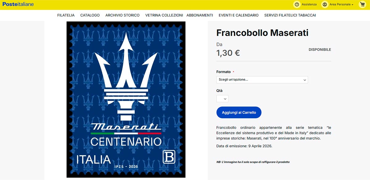 Yine de bu stratejinin diğer ucunda Maserati, radikal bir şekilde zıt bir nesneyi tanıttı: bir posta pulu. Roma'da 9 Nisan 2026 tarihinde tanıtılan bu özel pul, ünlü Maserati üç dişli mızrağının 100. yılını kutluyor. Poste Italiane tarafından 1.30 Avro fiyatla basılan pul, “Üretim sisteminin mükemmellikleri ve Made in Italy ”ye adanmış bir serinin parçasıdır.